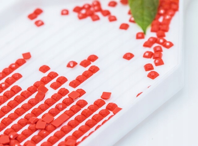 - Wybierz diamenciki: Znajdź na odkrytej części płótna odpowiednie symbole i numery, które odpowiadają kolorom diamencików. Wsyp porcję wybranego koloru kryształków do plastikowego pojemnika.