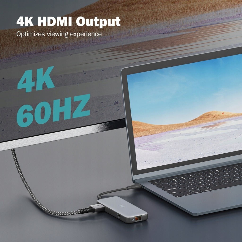 7-portowa stacja dokująca to idealne rozwiązanie do rozbudowy i optymalizacji stacji roboczej. Dzięki portowi HDMI dla dodatkowego monitora zewnętrznego, dwóm szybkim portom USB-A 3.2 Gen 2 (10 Gbit/s) - z których jeden ma funkcję ładowania urządzeń mobilnych, portowi Gigabit Ethernet (RJ45) dla niezawodnego połączenia sieciowego i dwóm czytnikom kart (SD/MicroSD) o dużej prędkości transferu, oferuje wszechstronną łączność. Umożliwia ładowanie notebooka przez port USB-C Power Delivery. Stacja dokująca obsługuje DP 1.4 Alt Mode, wstecznie kompatybilny z DP 1.2 Alt Mode. Obsługiwane są również HDCP 2.2, 1.4, 1.3 i HDR10+.