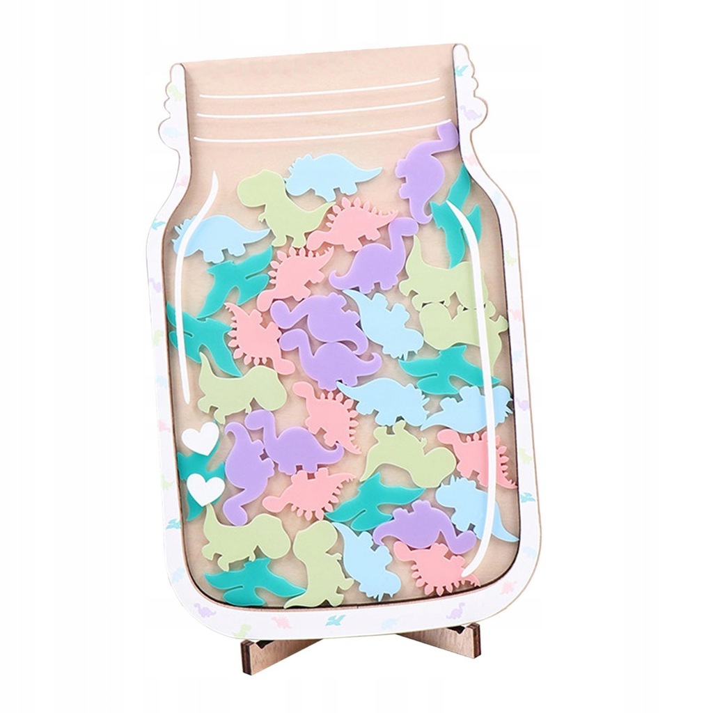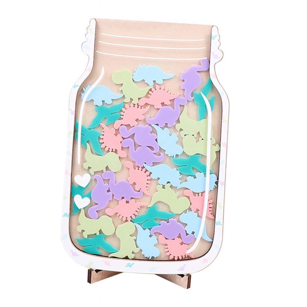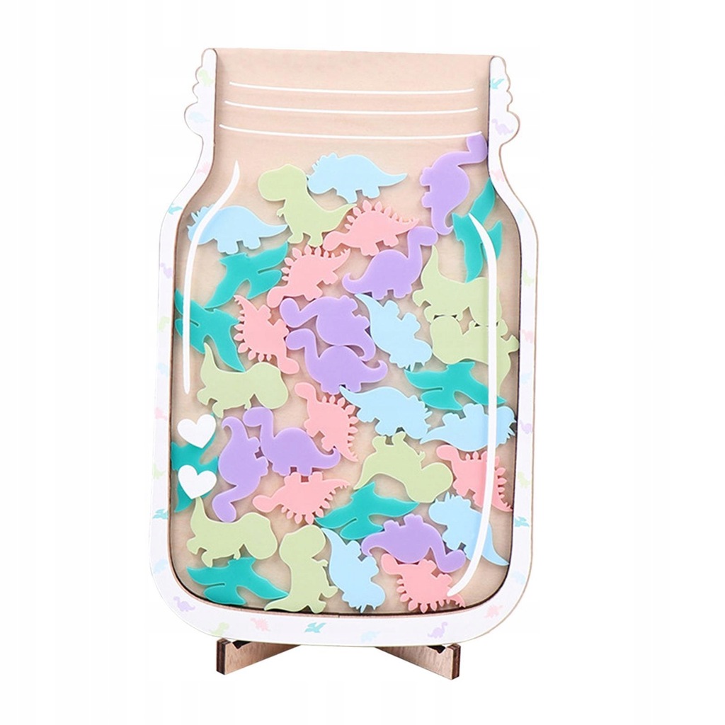 [Zestaw zawiera] 1-częściowy drewniany słoik na nagrody, z 35 kolorowymi dinozaurami i drewnianym stojakiem do ekspozycji na stole.
