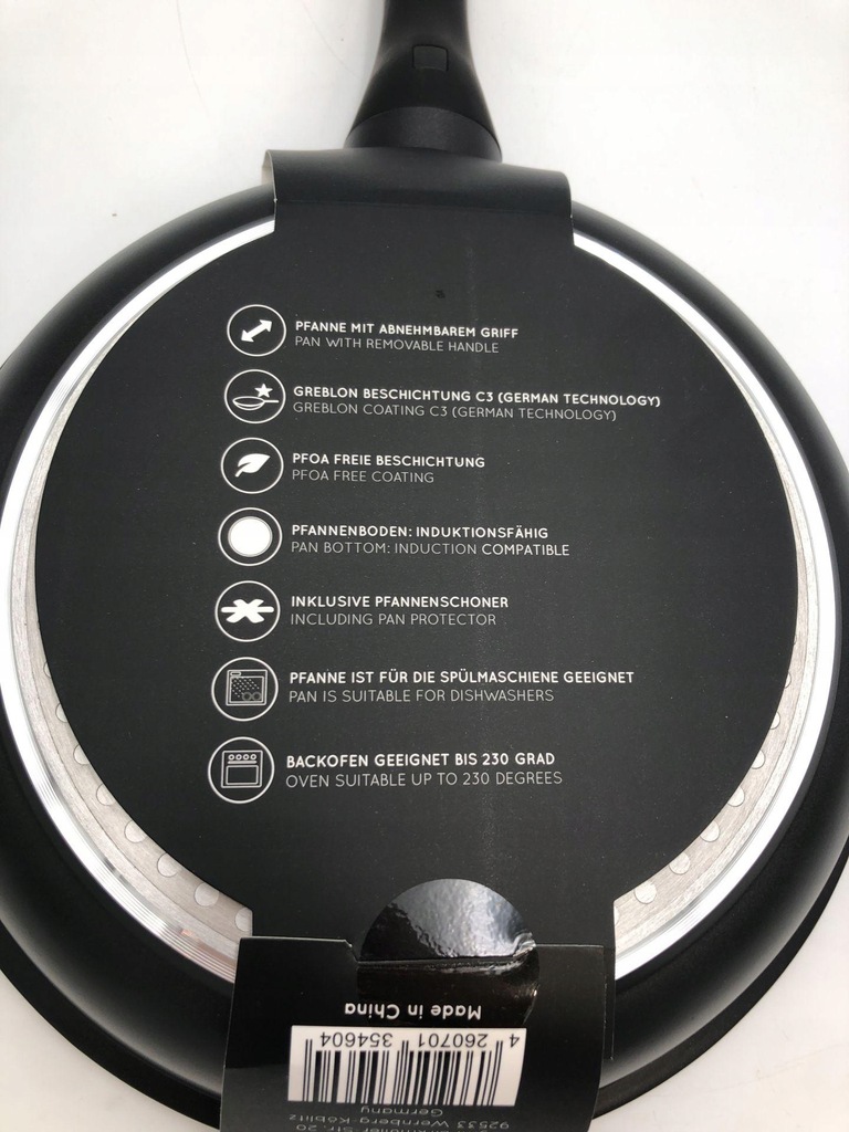 Zdejmowany uchwyt: uchwyt można łatwo zdjąć i ponownie założyć za naciśnięciem przycisku. Dzięki temu patelnię można myć w zmywarce i piekarniku do 230 stopni.