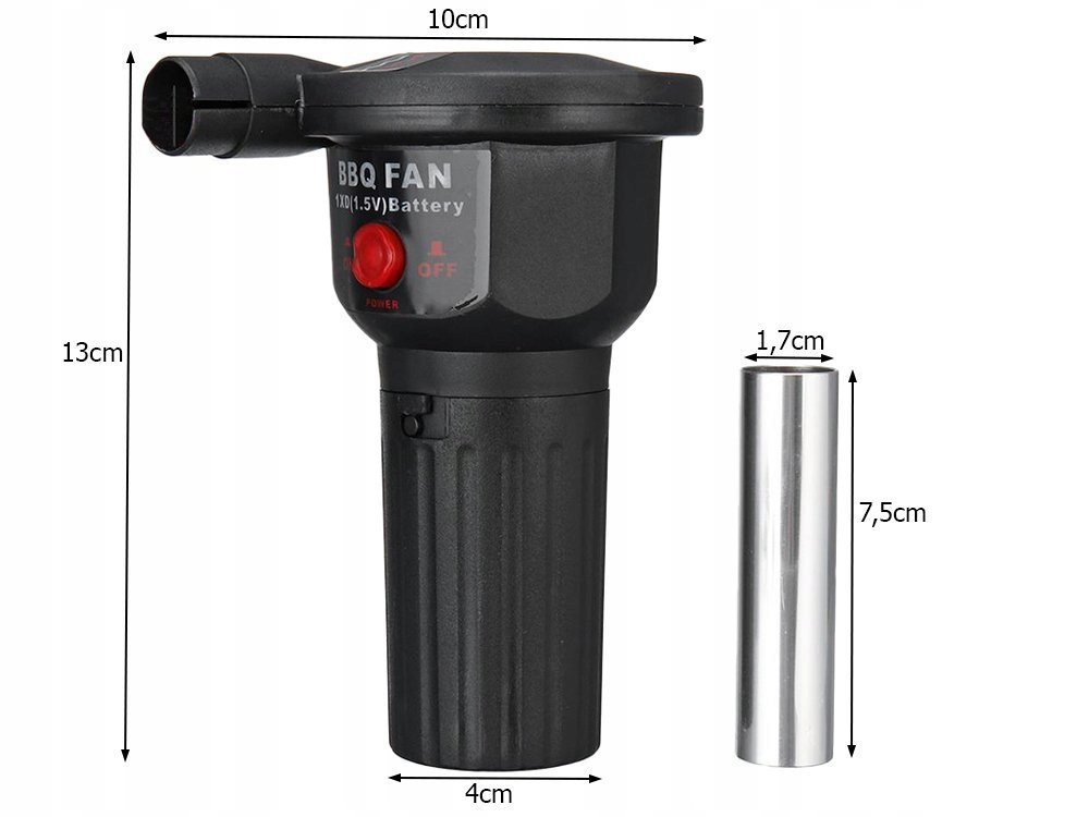 Urządzenie jest na baterie, wystarczy włączyć przycisk i zaczyna lecieć powietrze rozpalając żar. Niewielkich rozmiarów pozwoli na zabranie jej na wakacje, kempingi, pod namiot. Podczas chowania rurkę można odczepić.