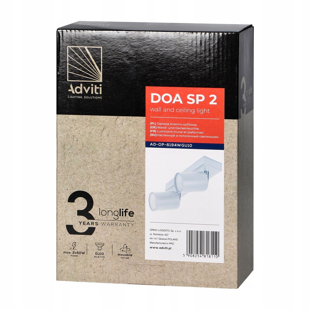 DOA SP 2, oprawa ścienno-sufitowa, GU10 max. 2x50W, IP20, biała, Orno, AD-O