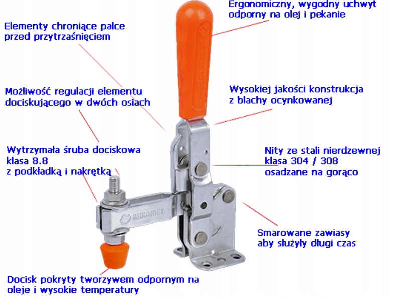 Dociski, zaciski oraz zapięcia to elementy mocujące, które mają szeroki zakres zastosowań w wielu gałęziach przemysłu. Produkty firmy KUKAMET zapewniąją odpowiednie zamocowanie elementów przy użyciu minimalnej siły. Wybrane modele docisków zaopatrzone są w system blokowania, który uniemożliwia otwarcie się docisku z powodu nagłego uderzenia, wibracji lub wstrząsu. Modułowe zaciski oraz szeroki zakres akcesoriów umożliwia samodzielną budowę docisku.