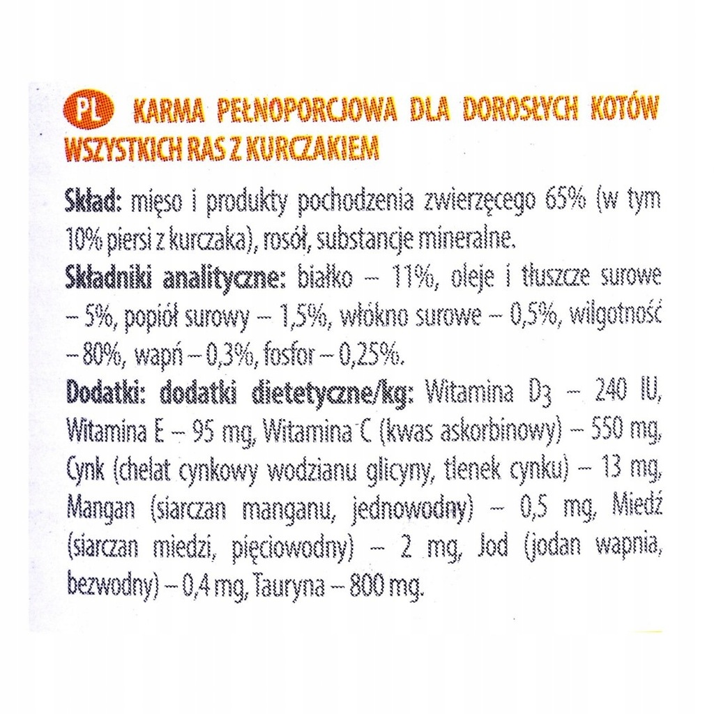 mięso i produkty pochodzenia zwierzęcego 65% (w tym 10% piersi z kurczaka), rosół, substancje mineralne