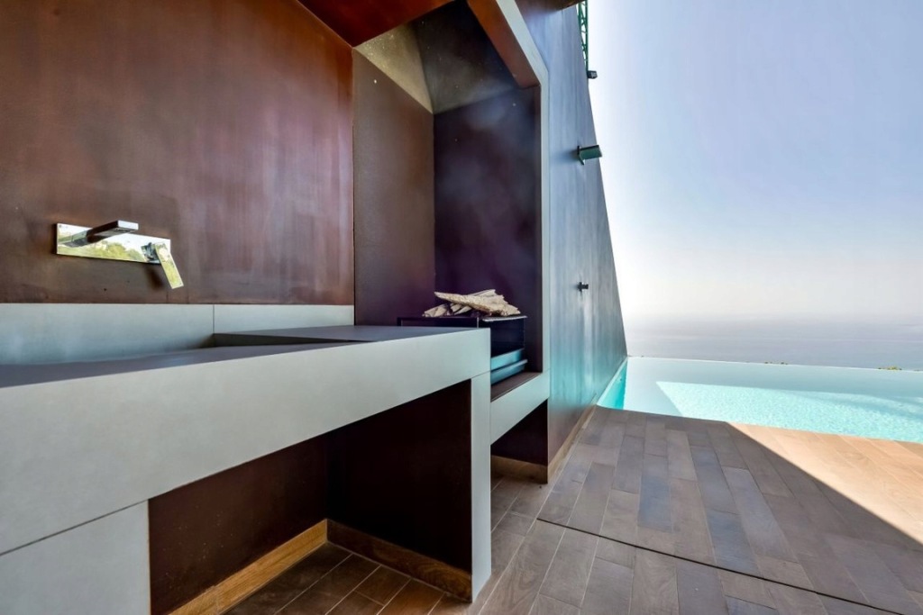 Trzy poziomy willi są połączone windą i schodami wykończonymi naturalnym orzechem brazylijskim. Parter jest podzielony na 2 strefy: przestronny salon z kuchnią-jadalnią, spiżarnią i łazienką, ukryty za drzwiami z przyciemnionymi lustrzanymi panelami zaprojektowanymi specjalnie dla tego domu, oraz oddzielną część z główną sypialnią, garderobą i dużą łazienką z bezpośrednim dostępem do tarasu z basenem i strefą relaksu. Pierwsze piętro jest podzielone na 2 części sypialne z dużą sypialnią, łazienką i garderobą w każdej z nich. Wszystkie pokoje na tym poziomie mają dostęp do tarasu z panoramicznym widokiem na morze.