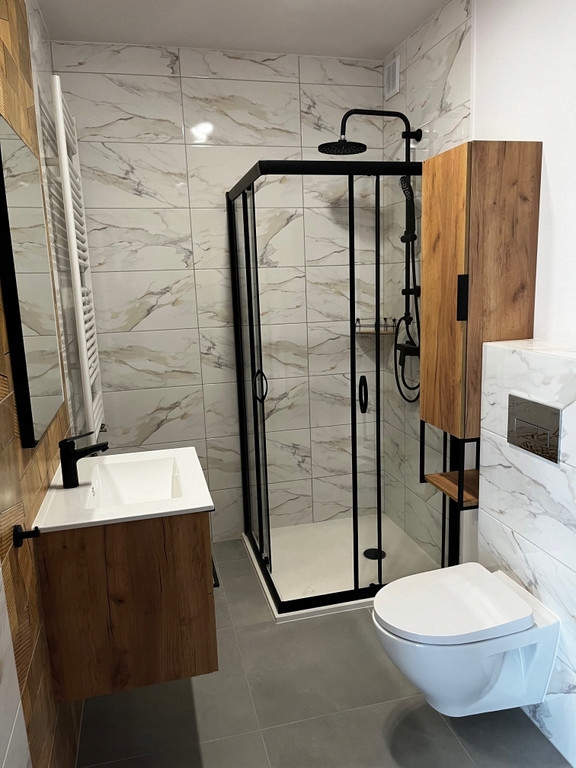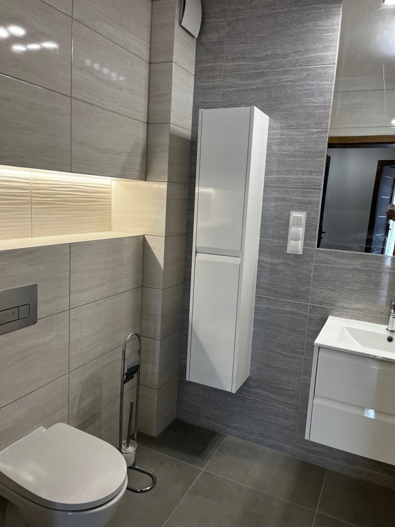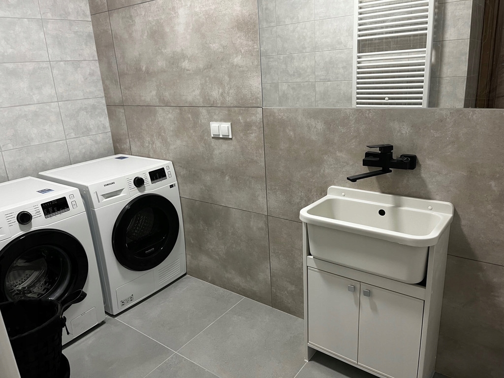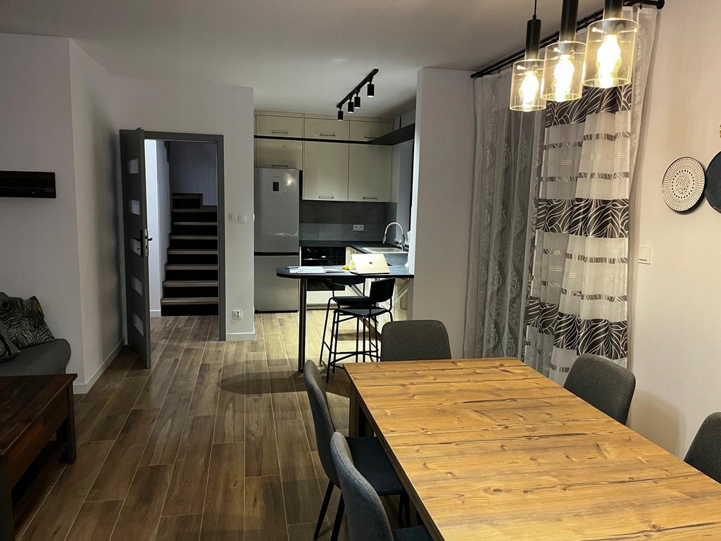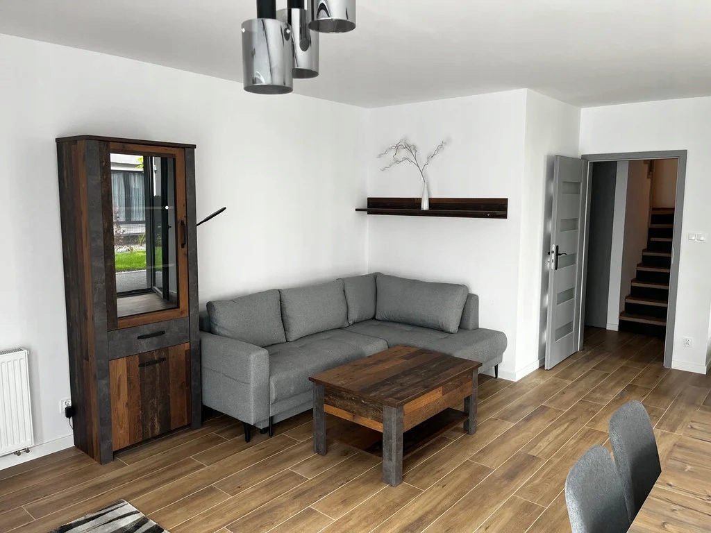 W domu znajdują się pralka i suszarka, zmywarka, kuchenka z mikrofalówka, płyta indukcyjna. Parter w pełni umeblowany, na piętrze, w każdej sypialni znajdują się łóżka i szafy. Możliwość doposażenia domu wg wymagań klienta.
