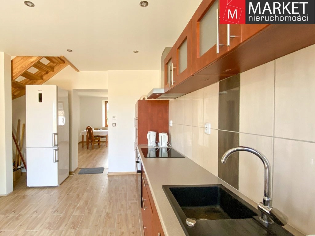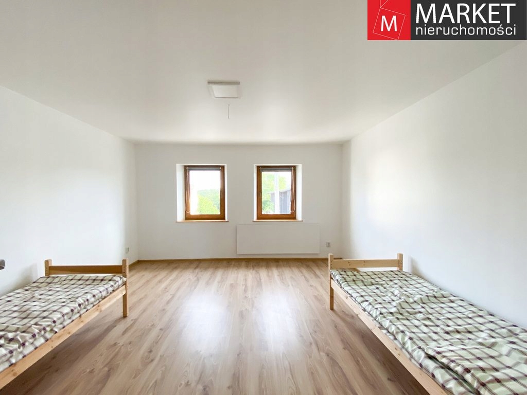 Dom wyposażony w meble kuchenne w zabudowie ze wszystkimi niezbędnymi urządzeniami, w pokojach łóżka (aktualnie 10 szt.) wraz z pościelą. W przypadku zainteresowania najmem możliwość doposażenia pokoi.