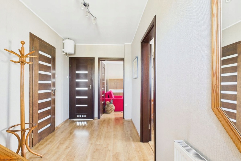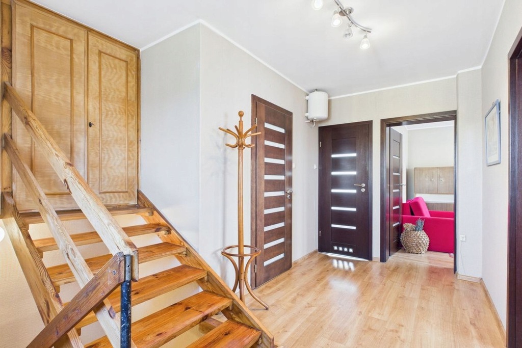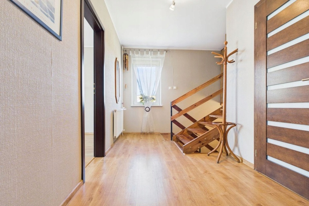 podłogi - na parterze drewniany parkiet, na piętrze panele, przedpokój kamienne płytki