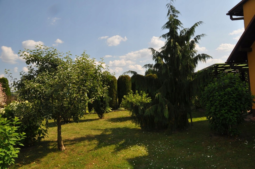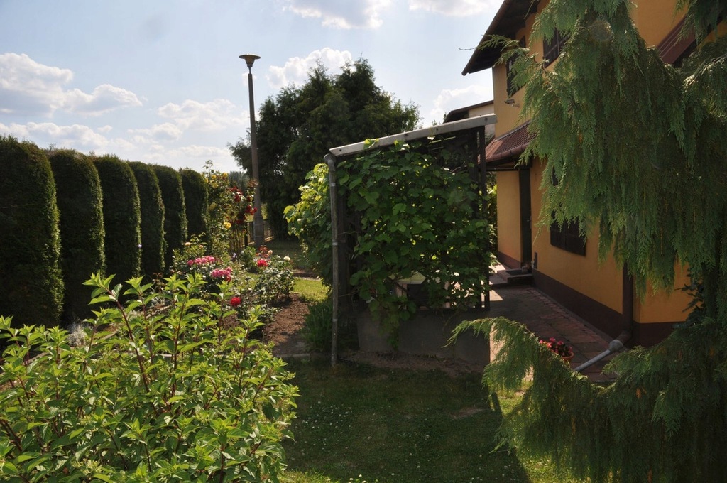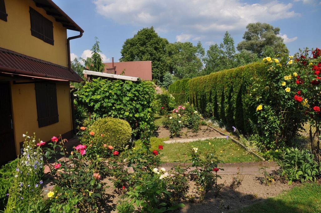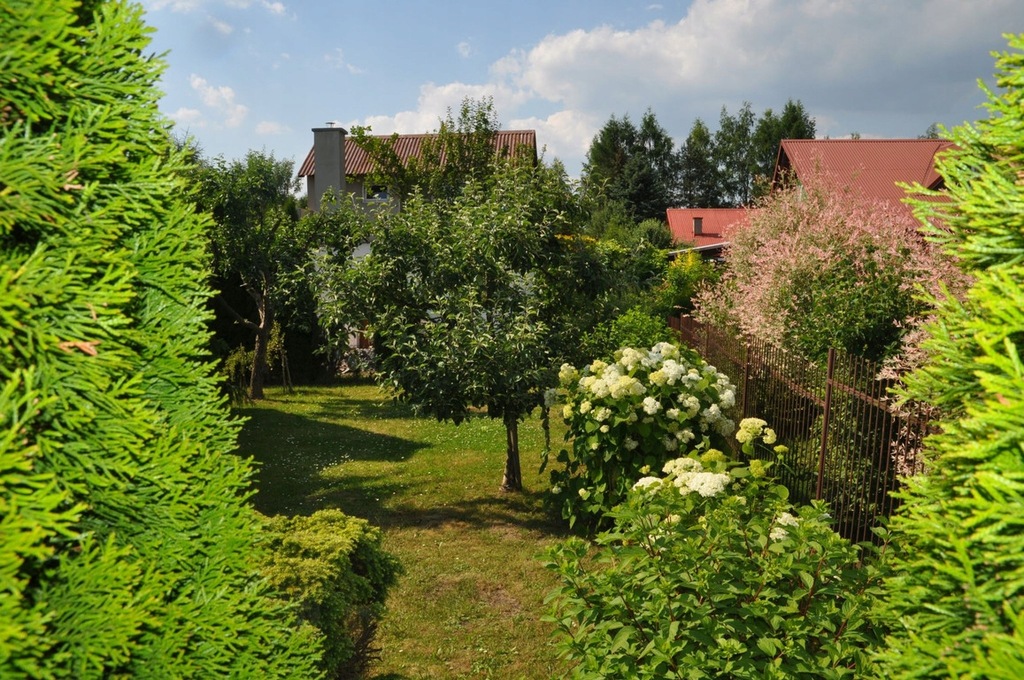 Działka jest w pełni zagospodarowana, obsadzona krzewami owocowymi i ozdobnymi (cyprysik nutkajski). Ogrodzona, od frontu żywopłot z pięknie uformowanych tui.