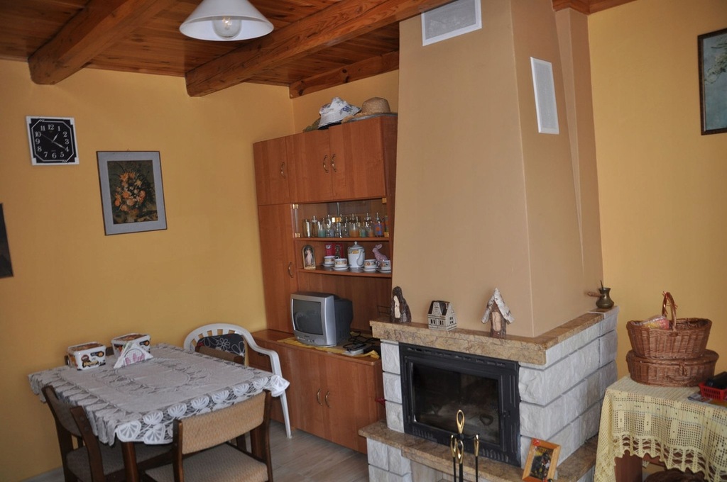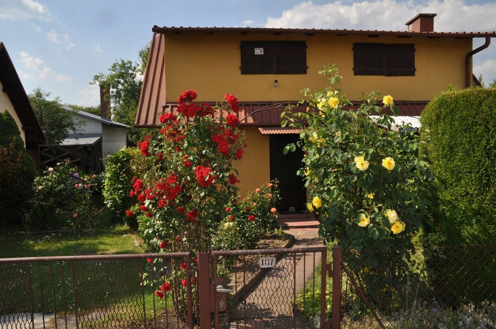 Domek murowany, dwukondygnacyjny, wybudowany w latach 90 ub. w. Na parterze znajduje się duży pokój z kominkiem, kuchnia, przedpokój, łazienka, pomieszczenie gospodarcze. Na poddaszu 2 sypialnie. Przed wejściem do domku bardzo funkcjonalna, zacieniona altana oraz wydzielone miejsce na postój samochodu. Z tyłu budynku pomieszczenie gospodarcze na narzędzia ogrodnicze. W budynku ogrzewanie kominkowe, ciepła woda z bojlera elektrycznego.