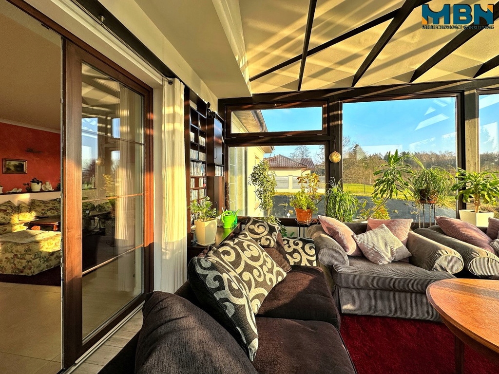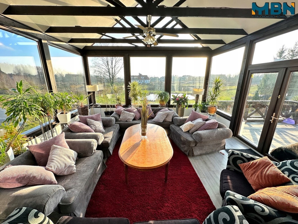 Dom posiada przeszklony ogród zimowy z widokiem na staw;