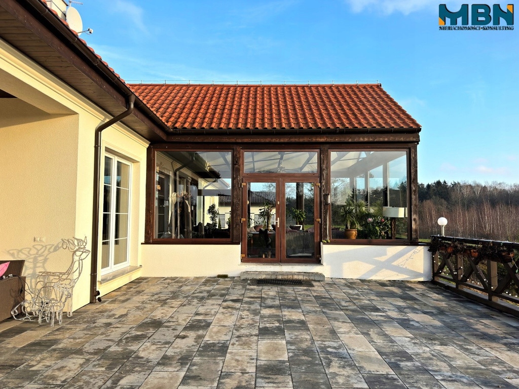 Taras wypoczynkowy i ogród zimowy zlokalizowany od strony południowej z widokiem na staw.