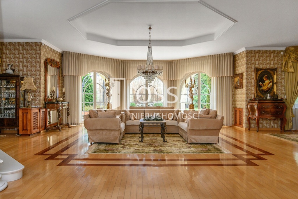 Przestronny salon z kominkiem i reprezentacyjnymi, półokrągłymi oknami, z widokiem na ogród