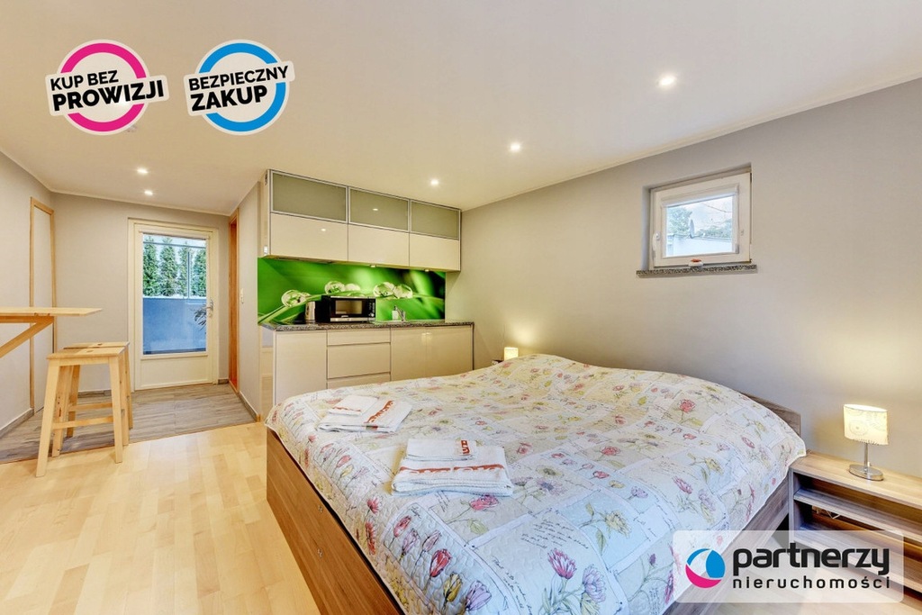 Przyziemie: Składa się z dwóch mieszkań. Pierwsze to studio z otwartym aneksem kuchennym i częścią sypialnianą, łazienką oraz balkonem. Drugie mieszkanie posiada osobną kuchnię, łazienkę, sypialnię i balkon, co czyni je idealnym dla par lub małych rodzin.