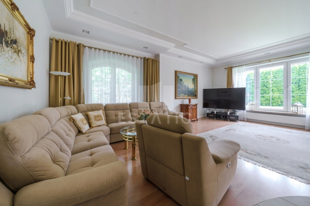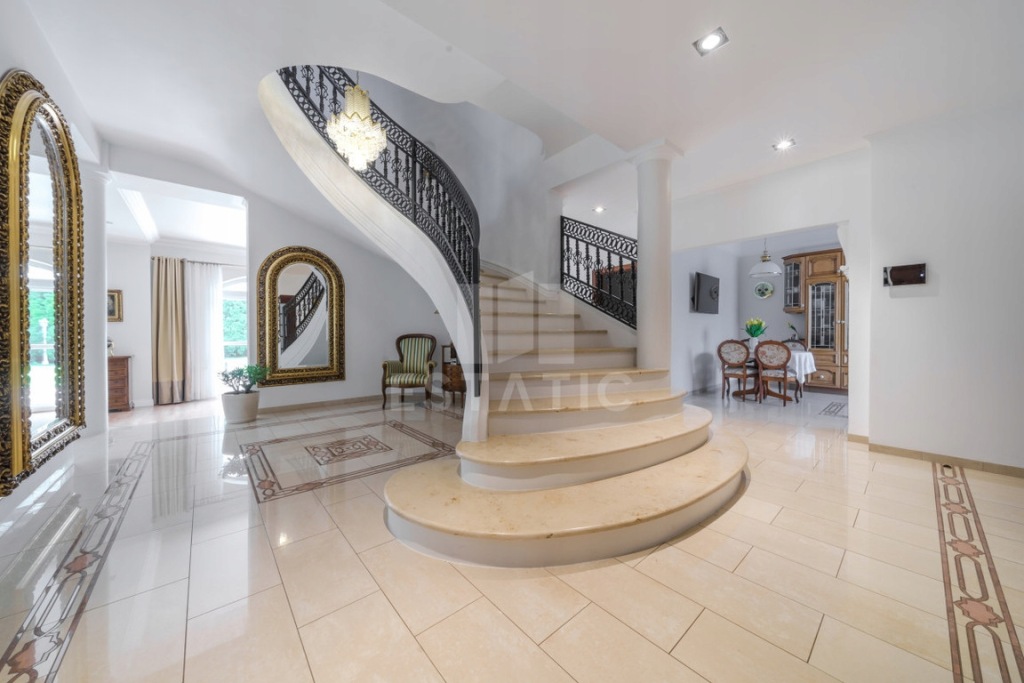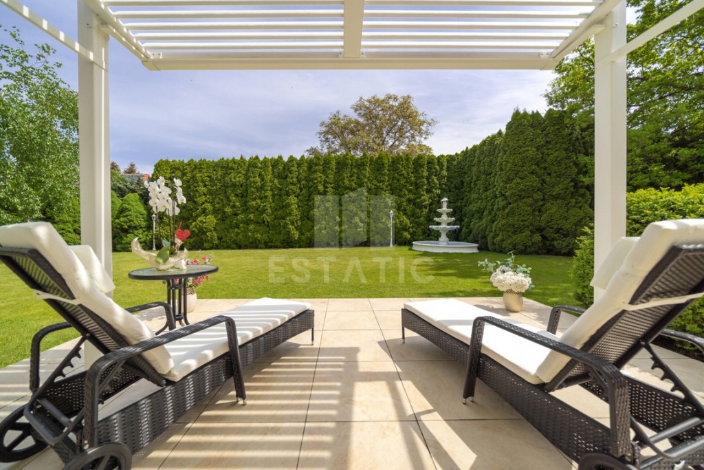 Willa, umiejscowiona na działce o powierzchni 1246 m2, otoczona jest pięknym, zadbanym ogrodem, który jest automatycznie nawadniany, a koszenie trawy odbywa się za pomocą robota. W ogrodzie można znaleźć wiele różnorodnych drzew i krzewów ozdobnych, a całości dopełnia harmonijna fontanna.