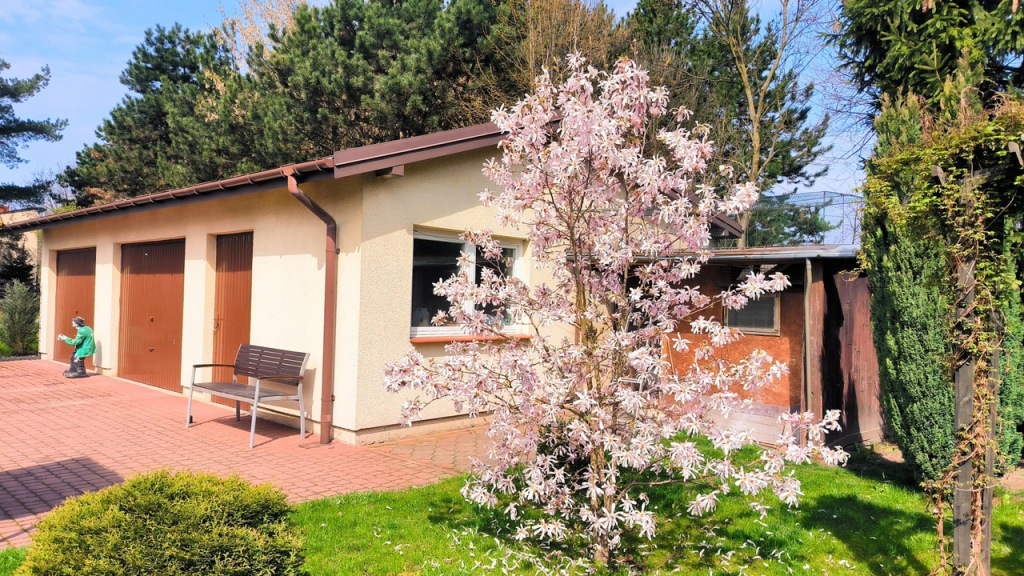 W pięknie zagospodarowanym ogrodzie z licznymi nasadzeniami dodatkowo garaż wolnostojący/pomieszczenie gospodarcze z 2(+) stanowiskami postojowymi oraz drewniana komórka do dyspozycji.