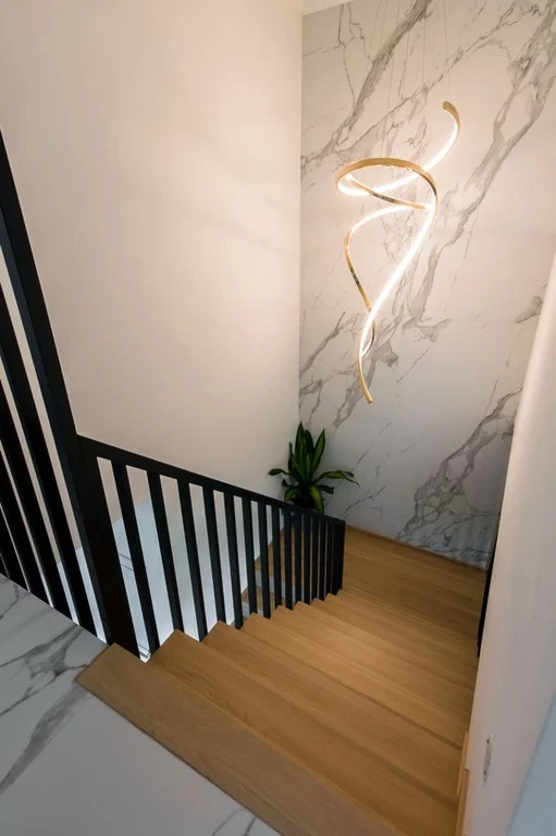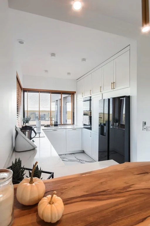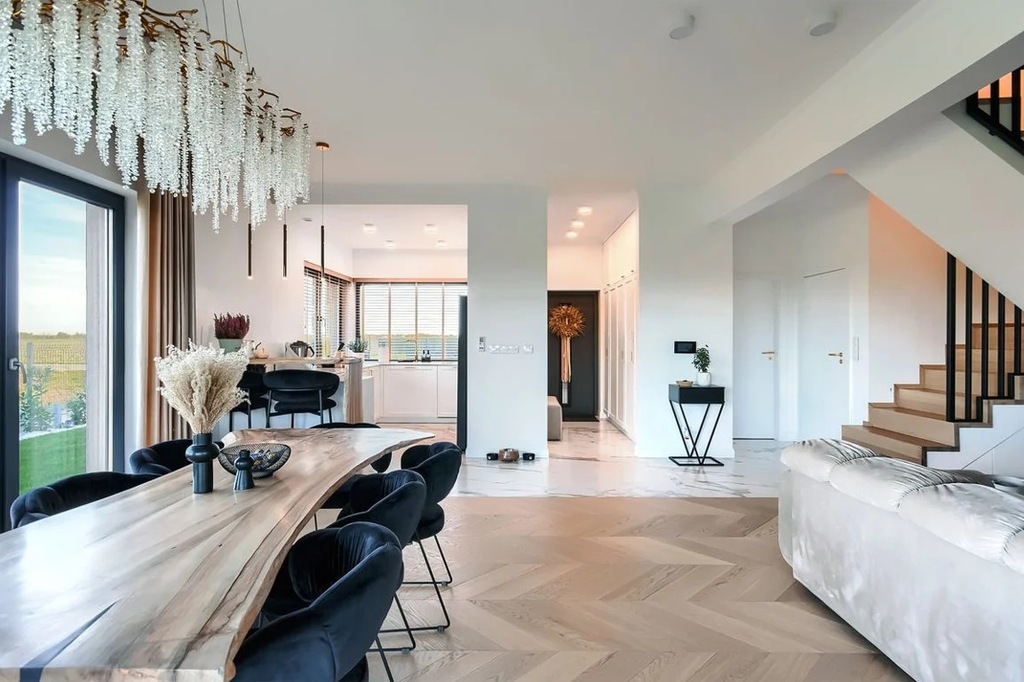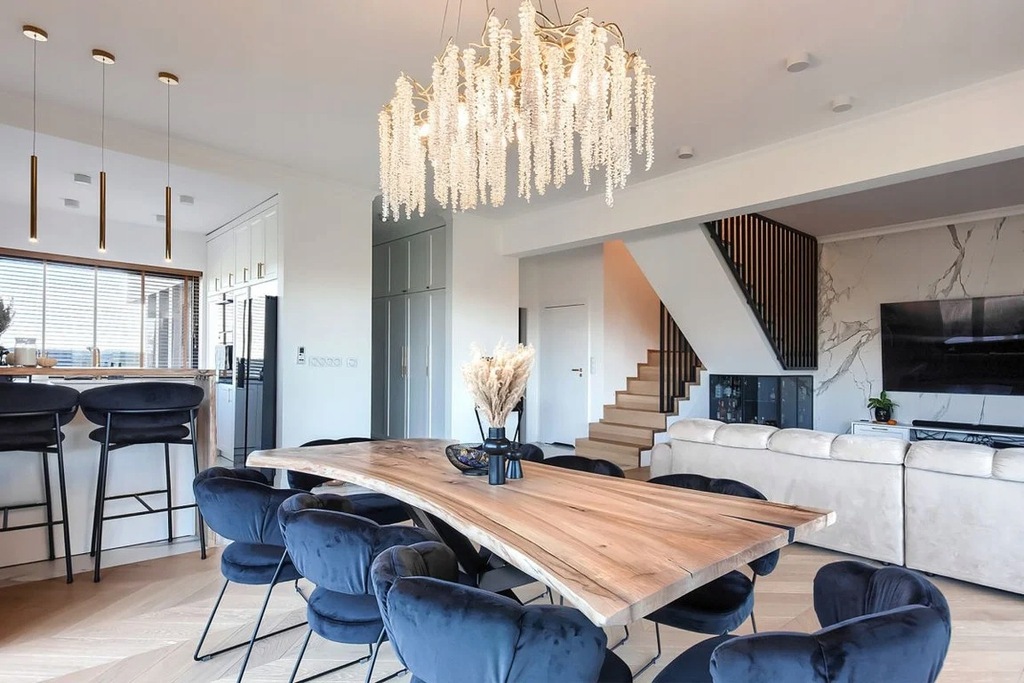 W kuchni znajdziemy nowoczesne meble wykonane na wymiar, zastosowano sprzęt AGD najnowszej generacji oraz eleganckie blaty, co nadaje pomieszczeniu zarówno funkcjonalności, jak i estetyki. Podłogi wykonane są z najwyższej jakości materiałów, drzwi wewnętrzne są indywidualnie dostosowane do zamówienia, a uwagę przyciągają kryształowe lampy i żyrandole, które dodają przestrzeni wyjątkowego charakteru.