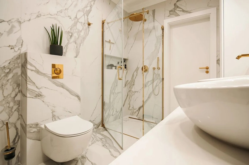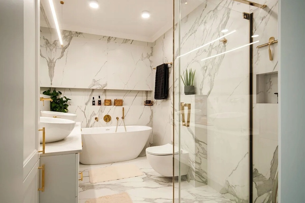 W łazienkach zastosowano materiały najwyższej klasy, zarówno pod względem kafli, jak i wyposażenia. Całość ogrzewana jest podłogowo, co podkreśla wysoki standard komfortu i nowoczesności w całym domu.