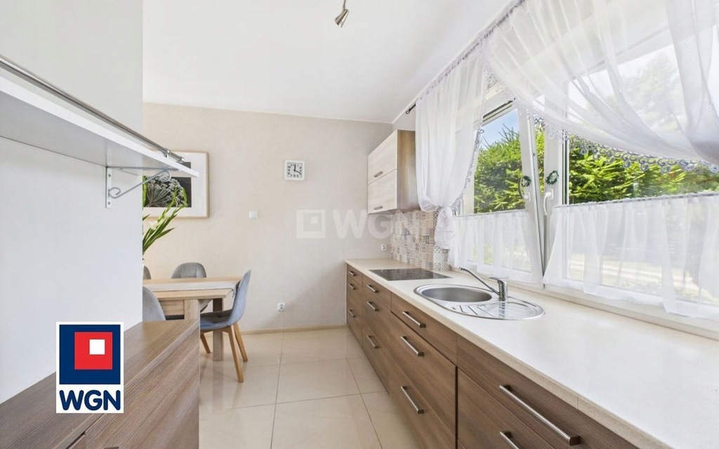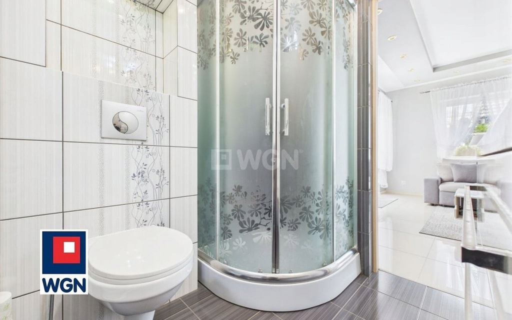 Salon połączony jest z kuchnią zajmując powierzchnię ok. 43 m2. Kuchnia wyposażona jest w nowoczesny sprzęt AGD (piekarnik Amica, płyta indukcyjna Elektrolux, lodówka Samsung). Na parterze znajduje się pierwsza łazienka z kabiną prysznicową o powierzchni ok.3.5 m2.