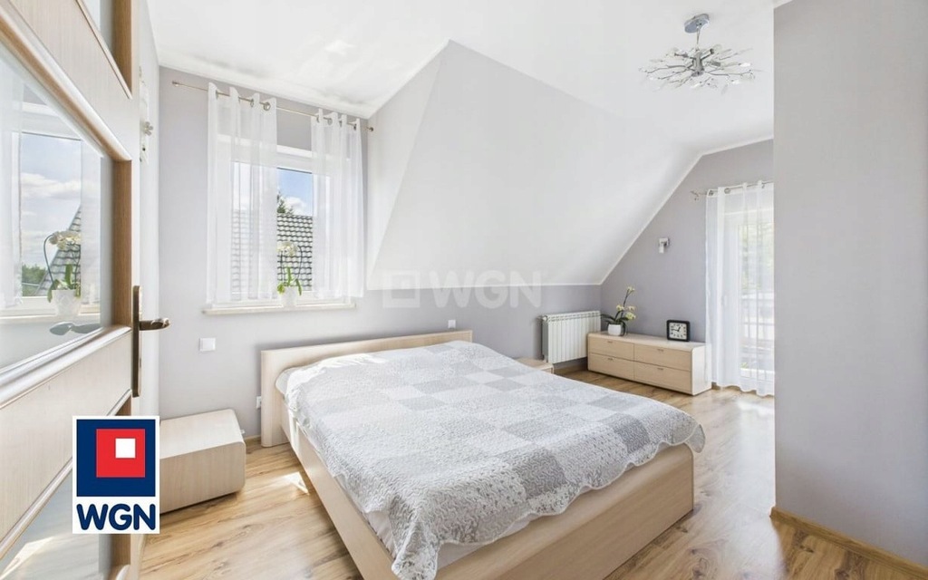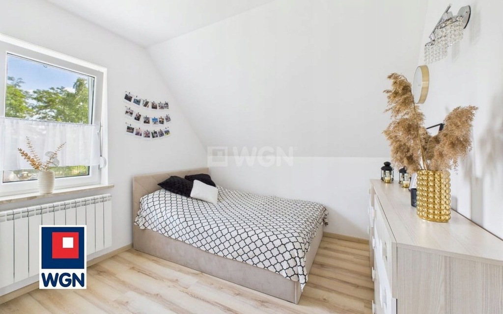 Piętro domu o powierzchni ok. 46 m2 składa się z przestronnej sypialni o powierzchni 15 m2, która doświetlona jest przez okno z wyjściem na balkon. Kolejne dwa pokoje o powierzchniach: 12.6 m2 i 10.4 m2 mogą pełnić role pokoi dziecięcych czy też sypialni dla gości. W ich sąsiedztwie znajduje się druga łazienka o powierzchni 4.8 m2 z dużą narożną wanną, która zachęca do dłuższego przebywania w niej oraz relaksu po ciężkim dniu pracy.
