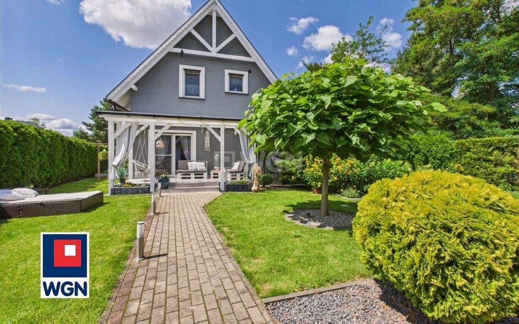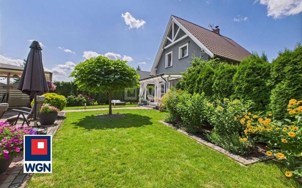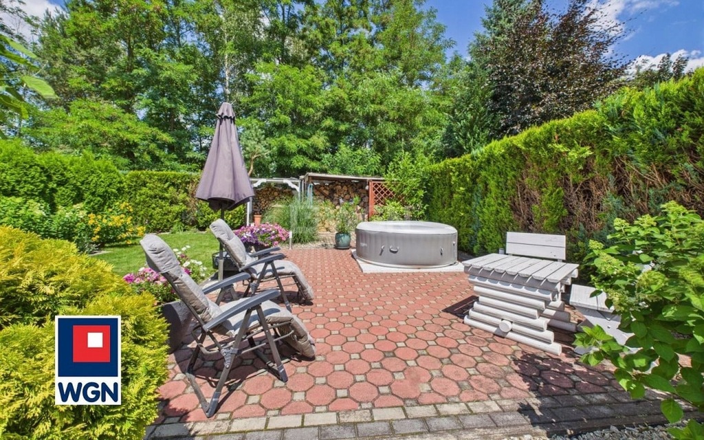 Z salonu przez duże przeszklone drzwi można wyjść na zadaszony taras.Spędzając na nim czas naszym oczom ukazuje się piękny, zadbany i zagospodarowany ogród. W ogrodzie znajduje się drewniana altana, która wraz z dużym stołem doskonale nadaje się na rodzinne spotkanie przy grillu. Dróżki w ogrodzie wyłożone są kostką brukową, została w nim też wydzielona strefa z miejscem na basen czy jacuzzi. Cała działka ogrodzona jest metalowym płotem , a z przodu znajduje się brama wjazdowa.