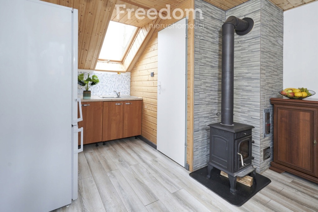 Dach domku wykonany jest z drewna, pokryty papą na solidnym deskowaniu, zapewniając trwałość i niezawodność. Fundamenty żelbetowe gwarantują stabilność konstrukcji, natomiast stolarka okienna i drzwiowa drewniana dodają uroku całej nieruchomości.