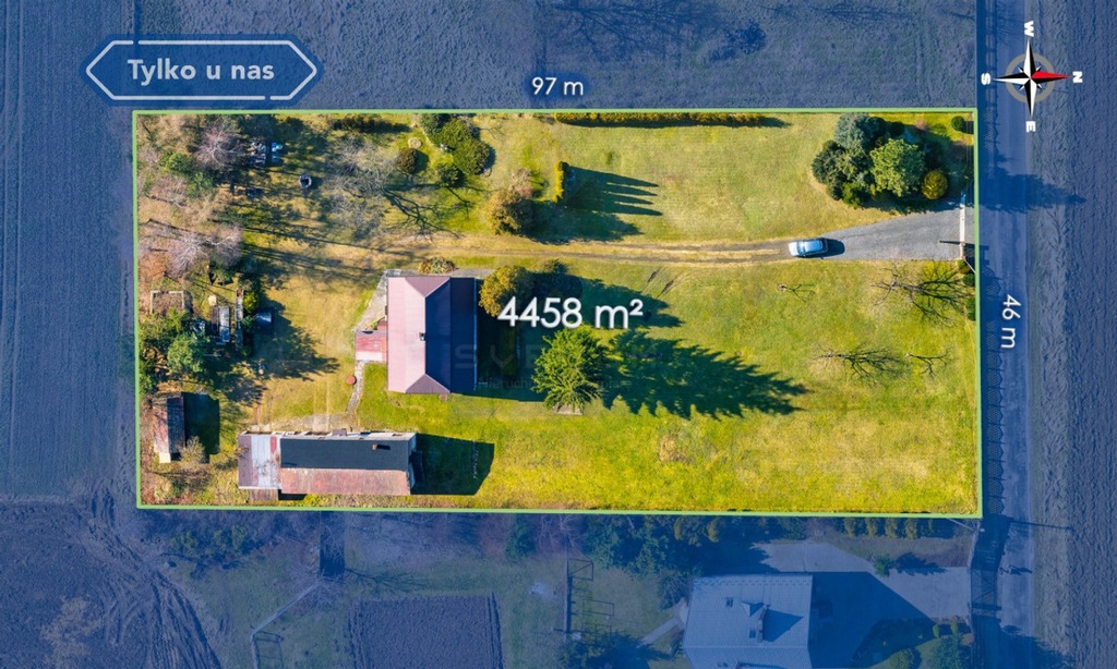 Działka o wymiarach: szer. ok 46 i dł. ok. 97 m