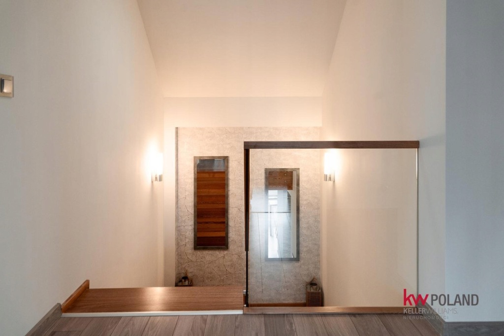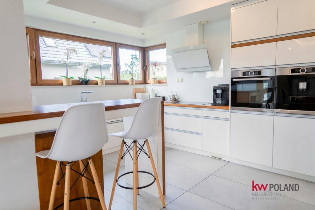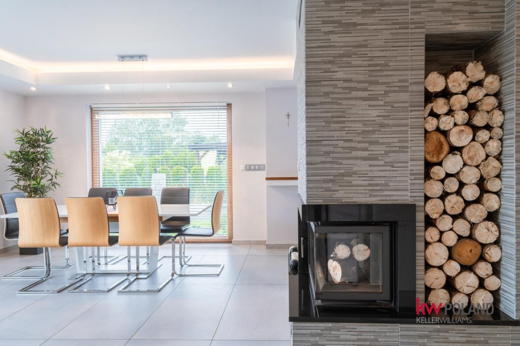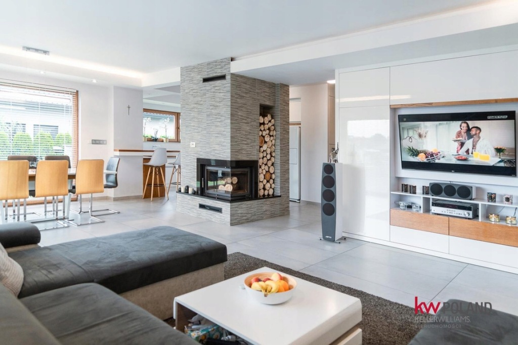 • bardzo duży salon połączony z jasną, otwartą, w pełni wyposażoną kuchnią, z kominkiem oraz z wyjściem na duży taras od strony południowej o powierzchni ponad 60 mkw