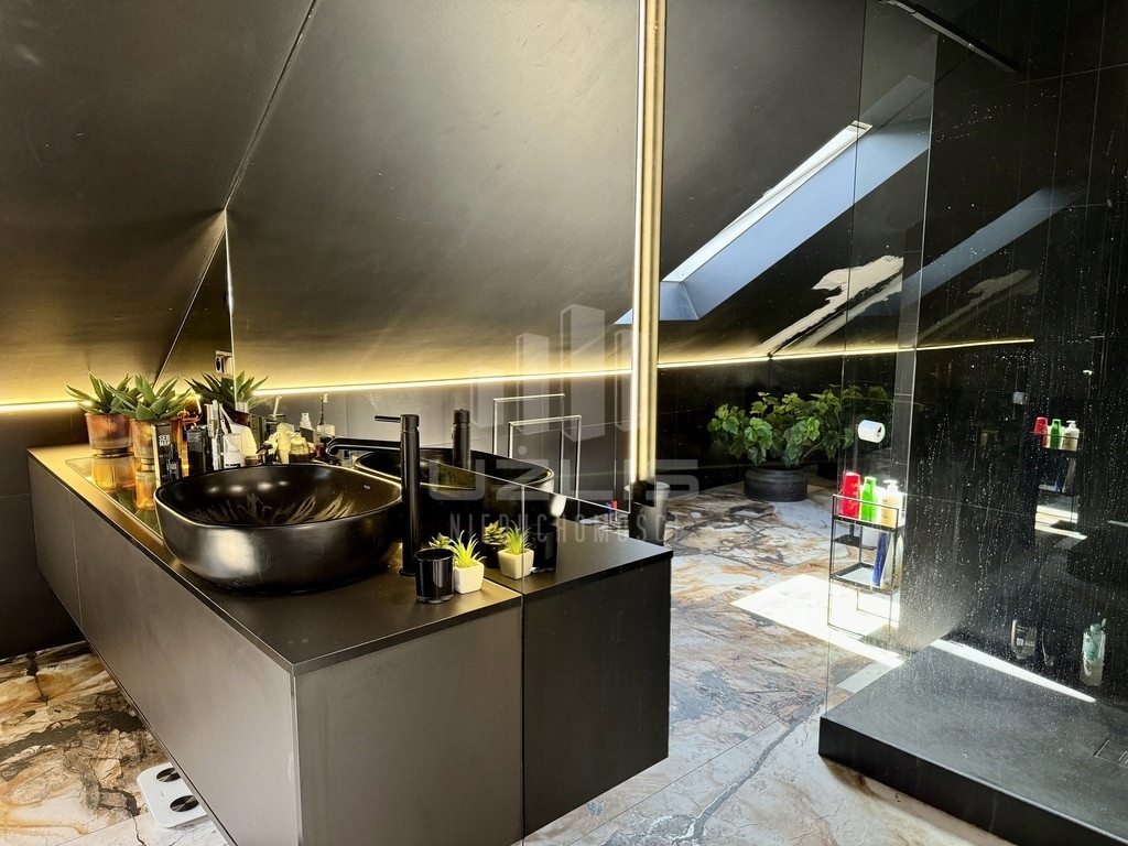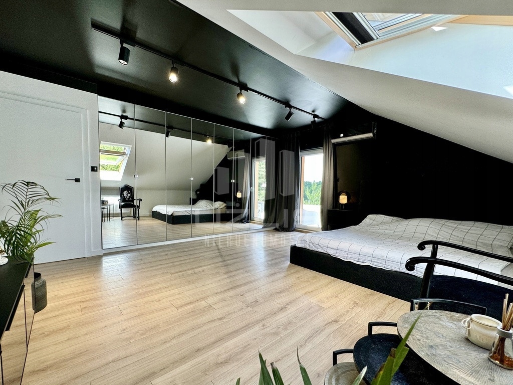 Na piętrze znajdują się trzy sypialnie, w tym dwie z wyjściem na słoneczny taras, oraz łazienka. Dom otacza taras o powierzchni 140 m², wyłożony drewnianą podłogą.