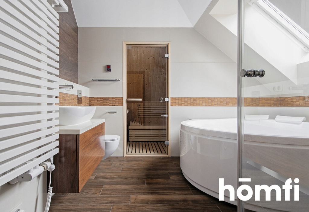 Pokój imprezowy, 2 sypialnie z garderobami, 2 łazienki, sauna, siłownia. Dodatkowo na strychu stworzona została dodatkowa garderoba.