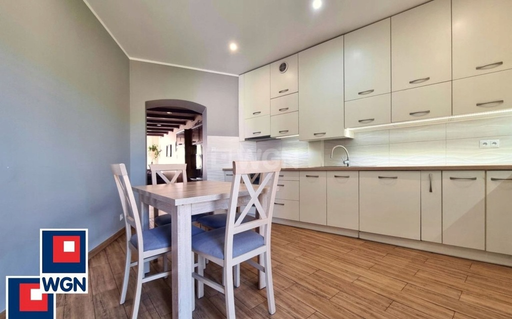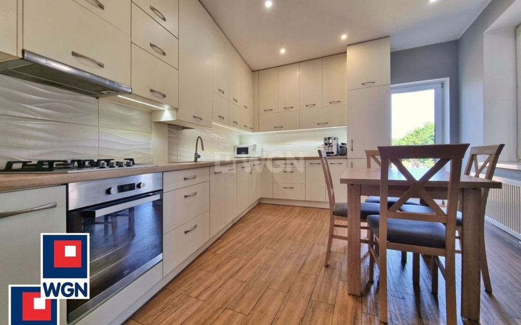 W kuchni został przeprowadzony remont 5 lat temu. Pomieszczenie zabudowane szafkami i szufladami zaopatrzonymi w system samo domykania. Wyposażone w nowoczesny sprzęt: lodówka w zabudowie, płyta gazowa i piecyk Beko, pochłaniacz Teka, zmywarka Amica. Na podłodze płytki drewnopodobne.
