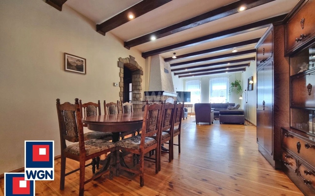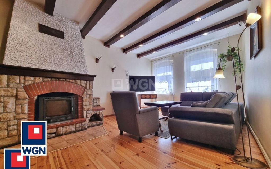 Przestronny salon z drewnianą podłogą, pięknymi, drewnianymi belkami pod sufitem oraz kominkiem tworzą przytulną atmosferę.