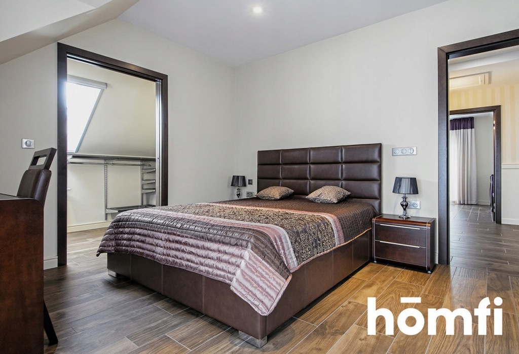 Pokój imprezowy, 2 sypialnie z garderobami, 2 łazienki, sauna, siłownia. Dodatkowo na strychu stworzona została dodatkowa garderoba.
