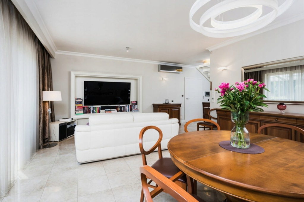 The house, with an area of approximately 140 m², is a spacious and comfortable space that provides convenience and functionality throughout the year. The ground floor features a spacious living room with a dining area, fully equipped with a large extendable table and chairs, as well as access to a covered terrace and a beautifully landscaped garden. The garden impresses with its large size, numerous plantings, space for growing herbs and vegetables, an irrigation system for the lawn, and a separate room for garden tools.