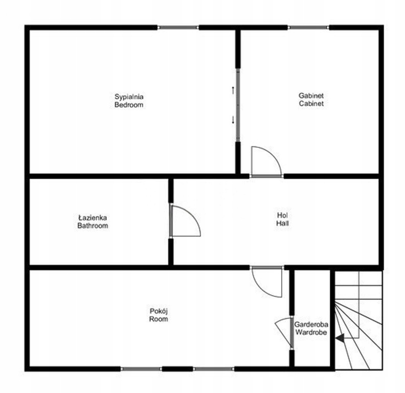 Na piętrze znajdują się komfortowa sypialnia, gabinet, odrębny pokój z garderobą oraz łazienka z nowoczesnym prysznicem, który dodatkowo pełni funkcję sauny. Z poziomu piętra prowadzi również wejście na strych, stanowiący dodatkową przestrzeń do przechowywania.
