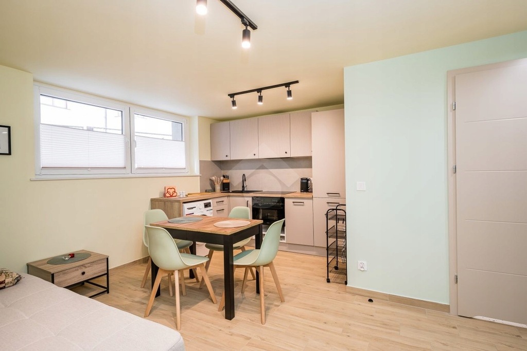 Parter: część wyremontowana, obejmuje salon z aneksem kuchennym, osobną sypialnię, schowek oraz łazienkę z WC. Na podłodze położono płytki. Aneks kuchenny w pełni wyposażony w lodówkę z zamrażarką, płytę indukcyjną, piekarnik, zmywarkę oraz sprzęty kuchenne. W łazience prysznic, umywalka, toaleta, lustro. W sypialni mieści się dwuosobowe łóżko oraz duża szafa. Ogrzewanie podłogowe elektryczne.