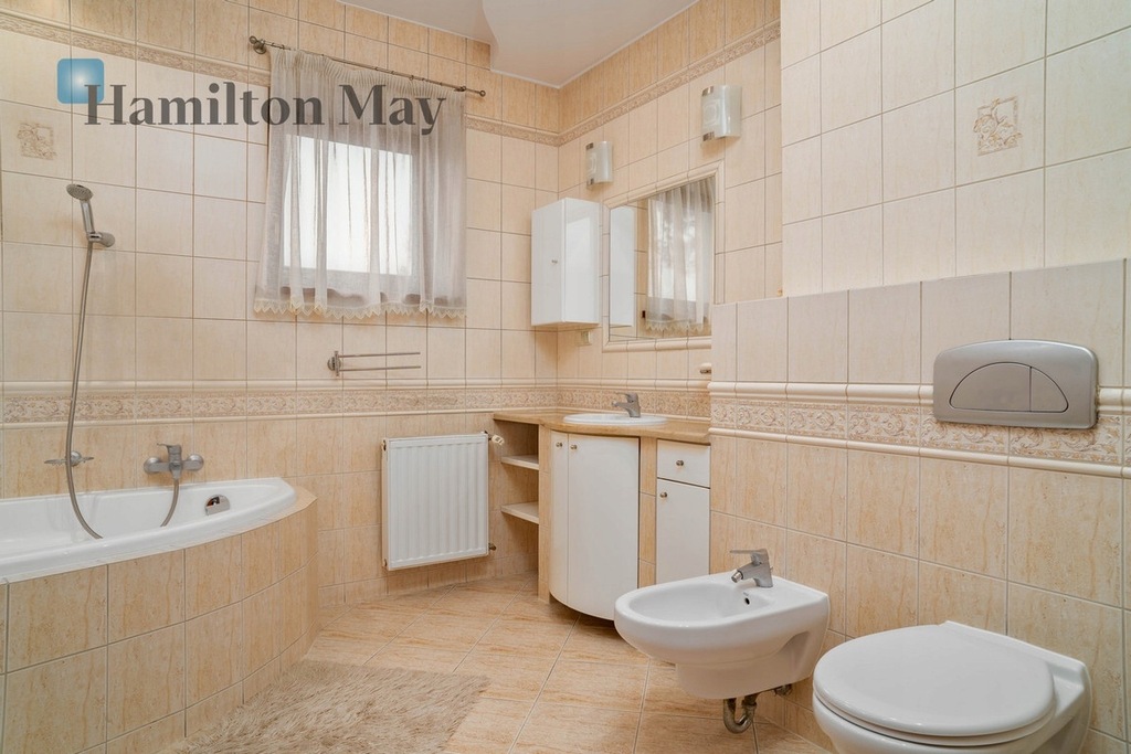 Nieruchomość urządzona w tradycyjnym stylu. Na podłodze znajduje się pięknie zadbany parkiet. Udogodnienia: fotowoltaika 16 kW, alarm, światłowód, klimatyzacja, kanalizacja miejska i piękny ogród.