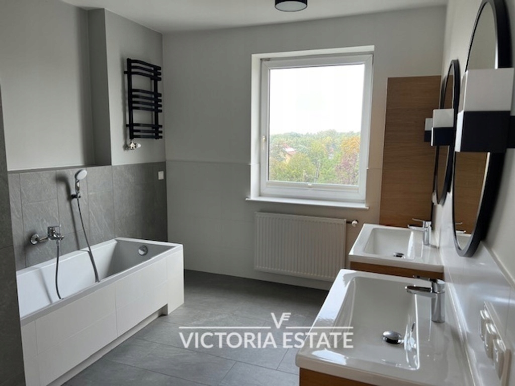 II piętro: 3 sypialnie, garderoba, pokój kąpielowy: 2 umywalki, wanna, toaleta z bidetem, wyjście na taras o pow. 8m2 z dwóch sypialni; ekspozycja południowa.