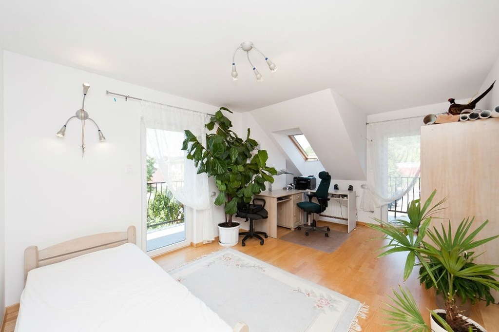 Na 1 piętrze są 3 sypialnie i bardzo duża łazienka, a na poddaszu 2 sypialnie, duża łazienka i przestronny przedpokój spełniający rolę otwartego pokoju wypoczynkowego z wyjściem na duży widokowy taras na południe.