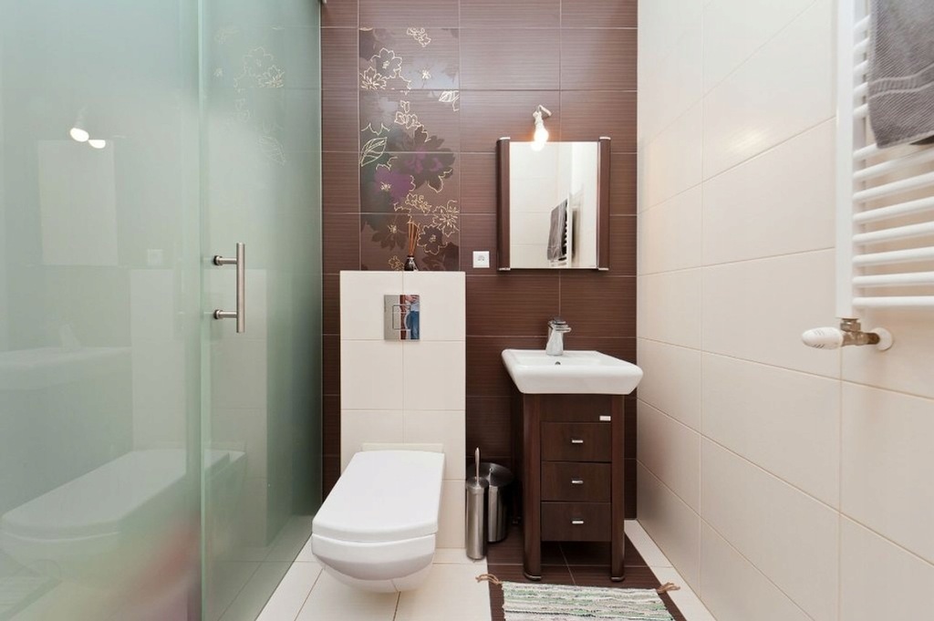 Łazienki bardzo gustownie i nowocześnie wykończone, w dolnej duża wanna narożna z hydromasażem, w górnej kabina prysznicowa.