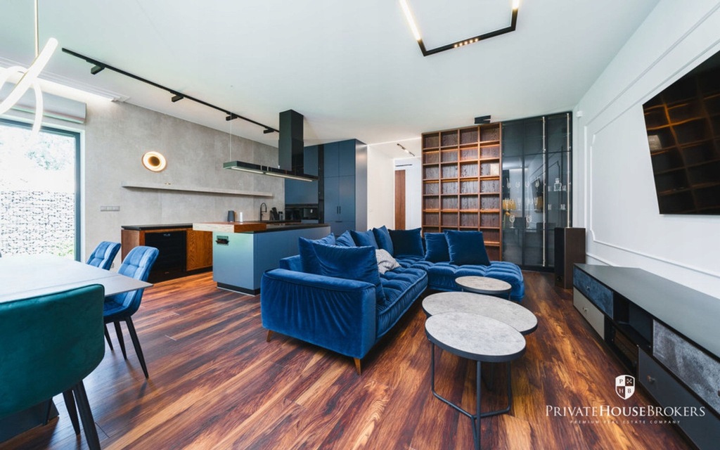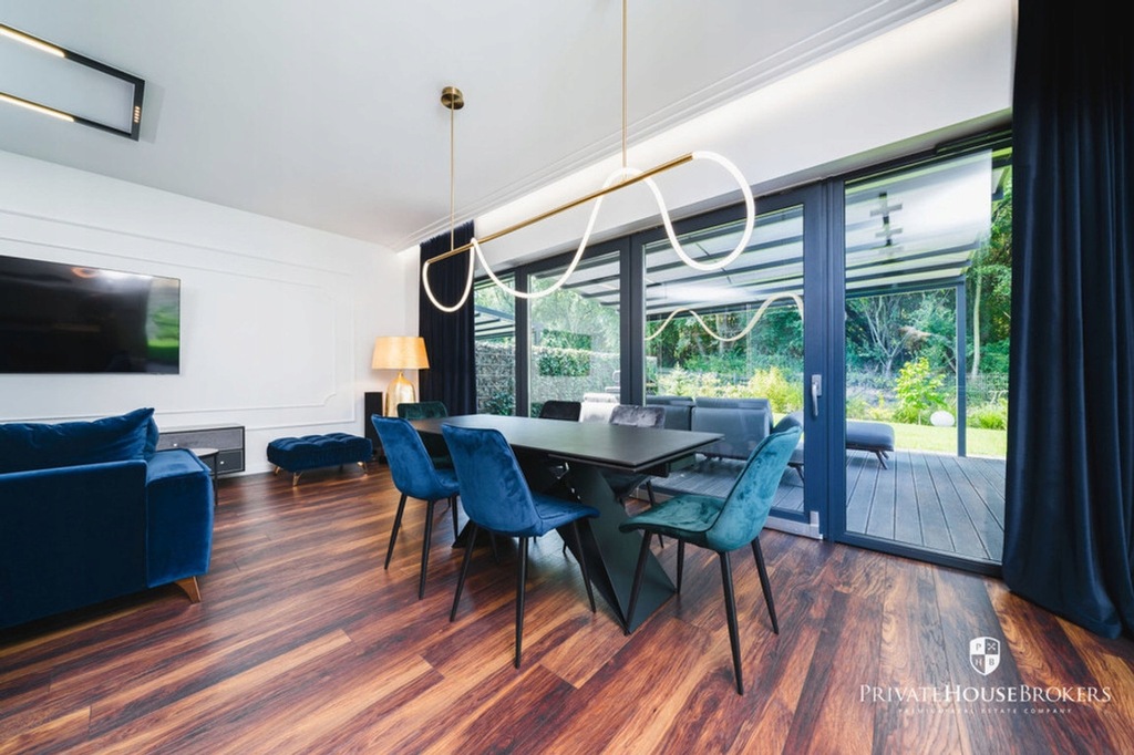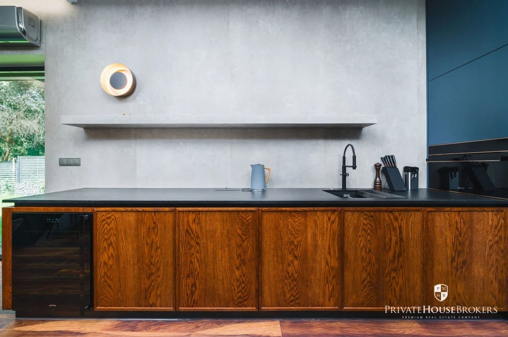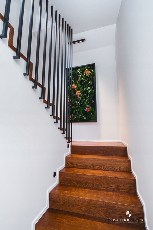 Znajduje się na kameralnym osiedlu z 2019 roku. Dom jest w pełni wykończony i wyposażony przy wykorzystaniu wysokiej klasy materiałów i sprzętów. Drewniane podłogi, najwyższej jakości armatura, beton architektoniczny, granitowe blaty czy sprzęt takich firm jak SMEG i Miele. Na powierzchnię użytkową 247m2 składają się 3 kondygnacje, na których wydzielono: