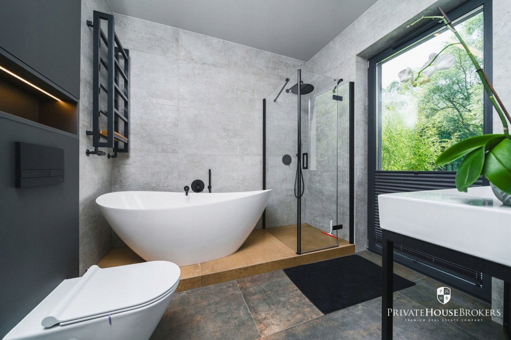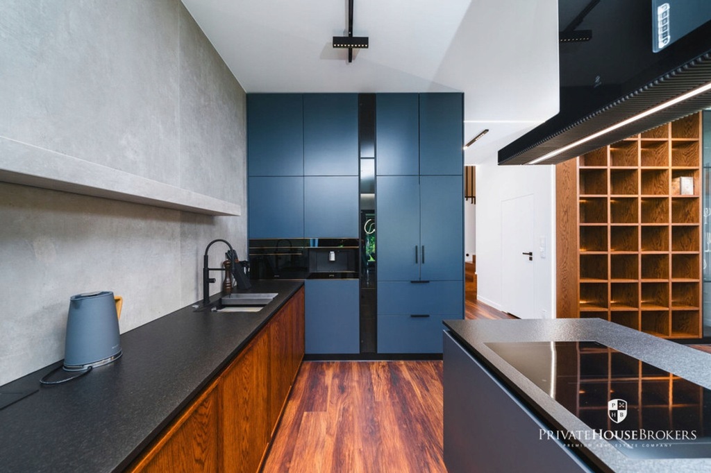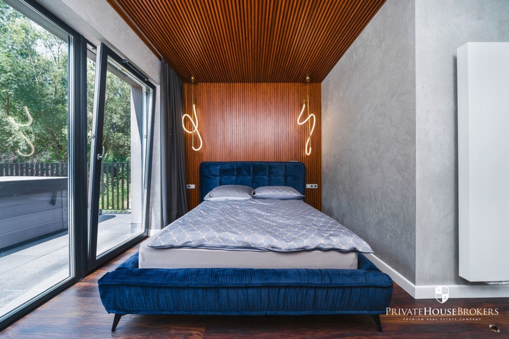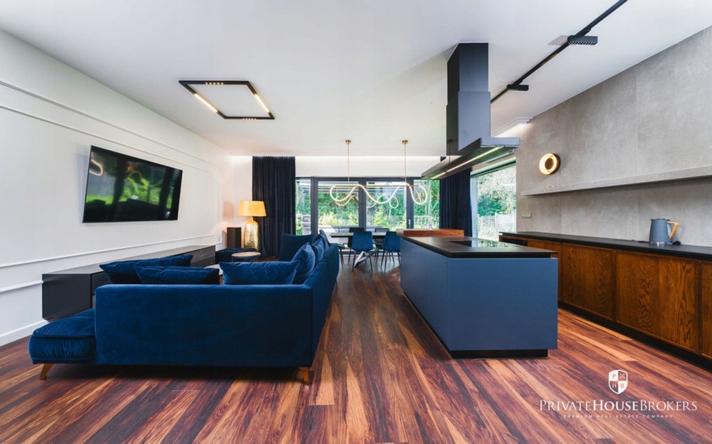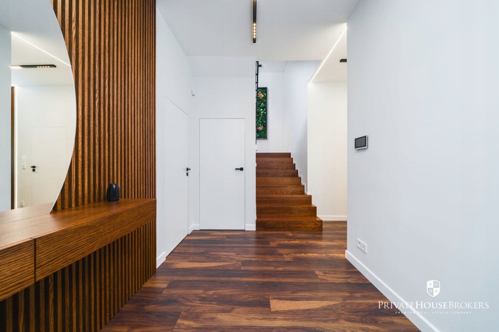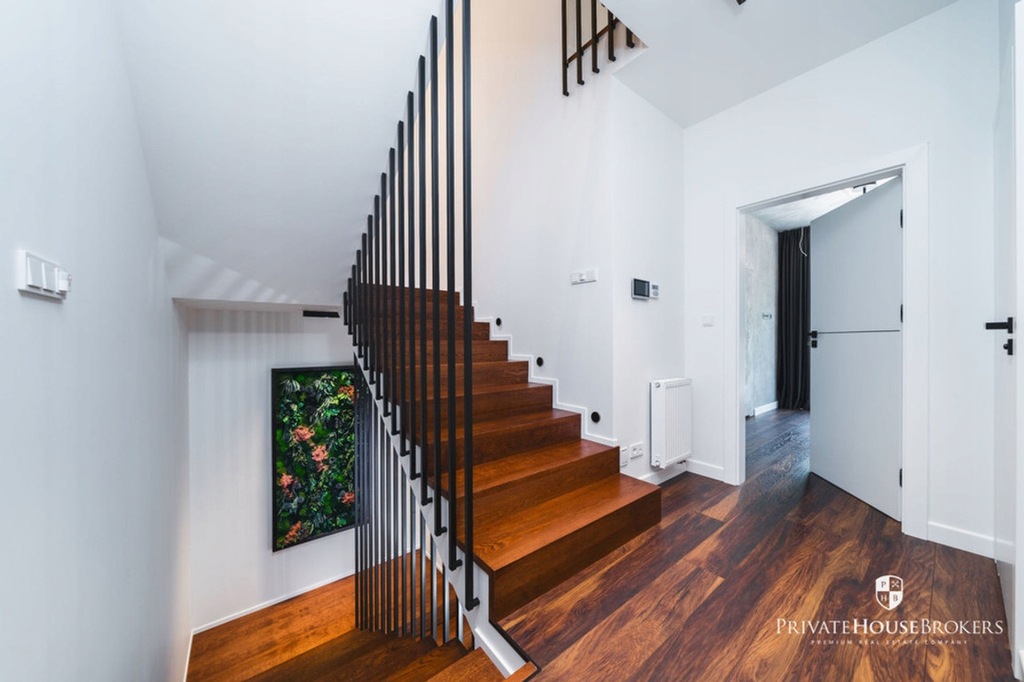 It is located in the intimate estate, which was put to use in 2019. The house is fully finished and equipped with the use of high-quality materials and equipment. Wooden floors, top-quality fittings, architectural concrete, granite countertops and equipment from companies such as SMEG and Miele. Its area of 247m2 consists of 3 floors, which are divided into: