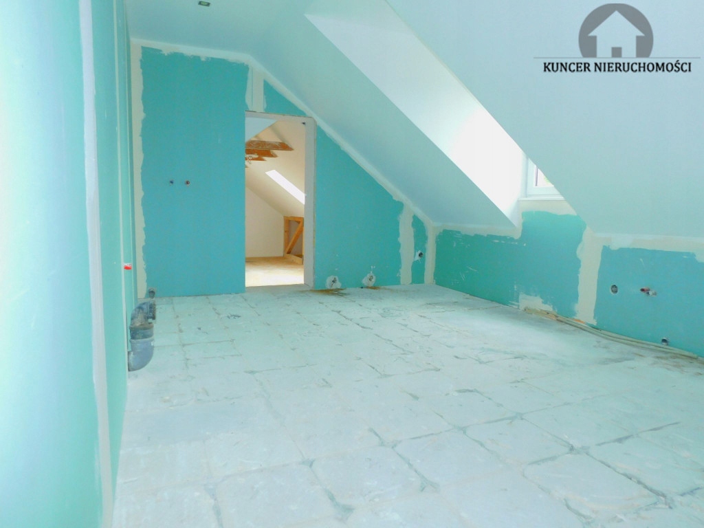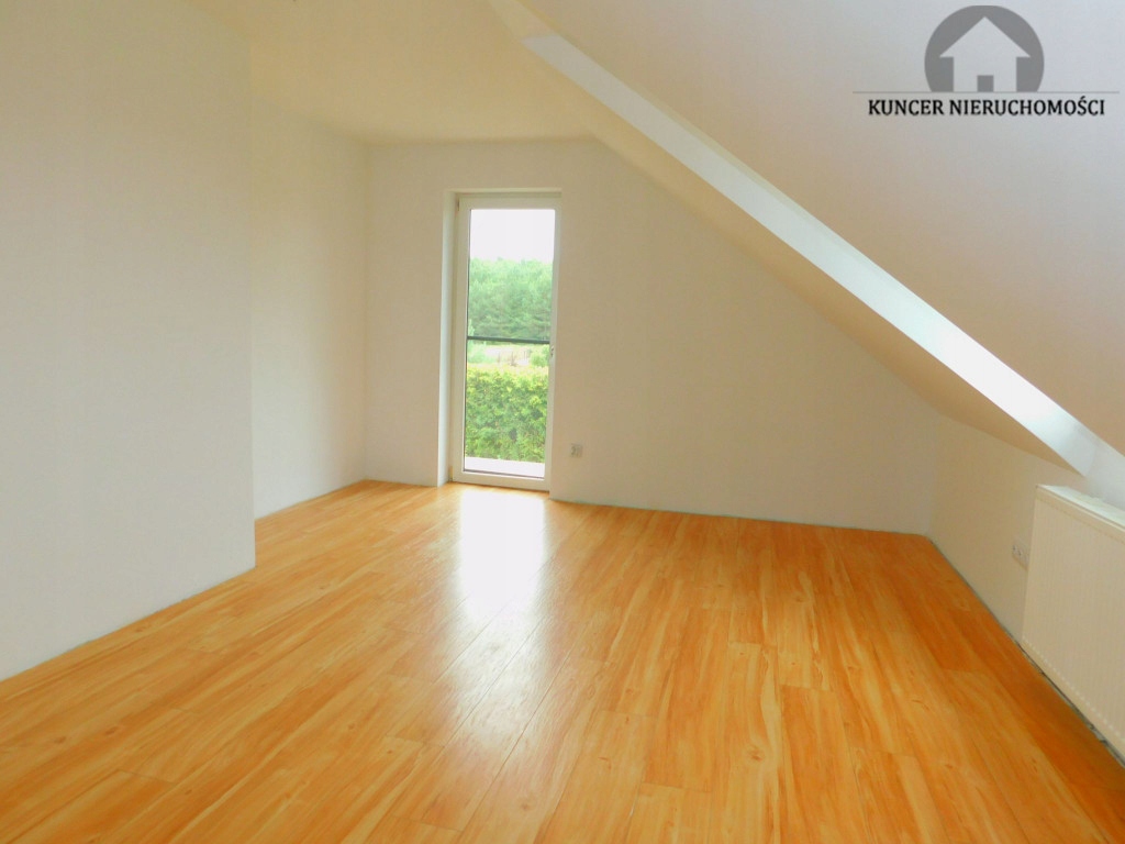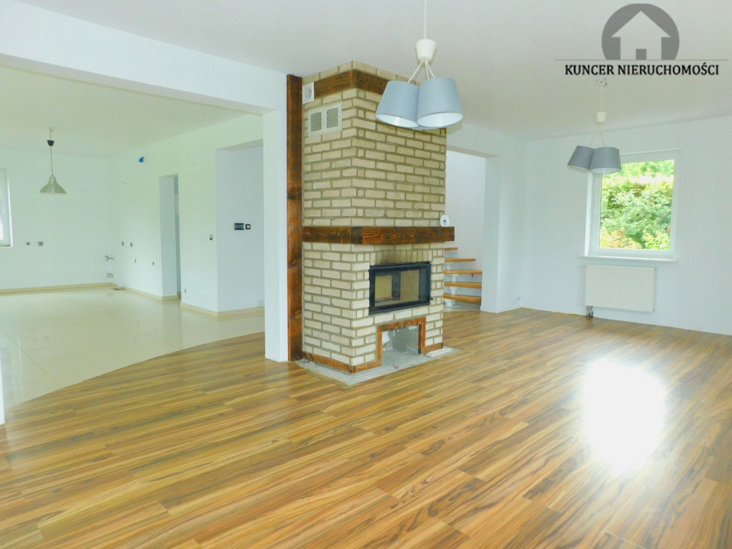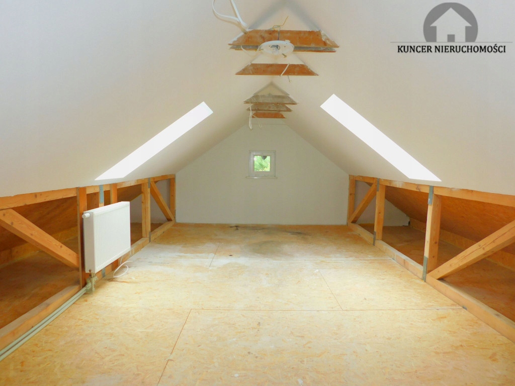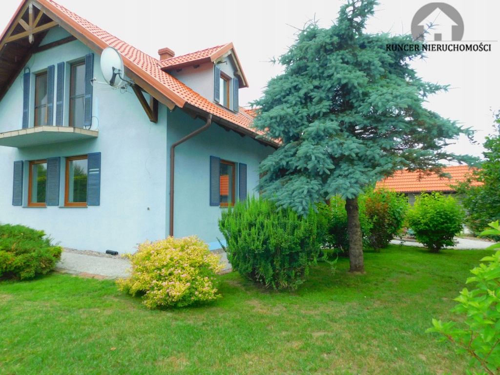 Dom jest parterowym budynkiem mieszkalnym z poddaszem użytkowym zbudowanym w 2008r położonym na skraju lasu. Parter domu, który pełni funkcję dzienną składa się z pokoju dziennego z kominkiem i wyjściem na taras od strony południowej, kuchni, jadalni, garderoby, wc, hollu z komunikacją, kotłowni w której zamontowany jest piec marki Heiztechnik na pellet z podajnikiem o mocy 25 kw, zasobnikiem CWU o pojemności 300 litrów i z, której jest bezpośrednie wejście do dwustanowiskowego garażu o powierzchni 39m2 oraz wiatrołapu. Poddasze pełniące strefę sypialnianą stanowią trzy pokoje, łazienka, schowek oraz holl z komunikacją. Wnętrze domu jest przestronne i widne. Stolarka okienna: okna PCV. Teren posesji został ogrodzony, a działka w całości zagospodarowana, w obrębie działki występują nasadzenia z krzewów ozdobnych oraz sad z drzewkami owocowymi: śliwa, czereśnia, orzech włoski, porzeczki, agrest i borówki, pozostałą część ogrodu w, którym znajduje się również drewniana pergola wypełnia trawnik. Wjazd na posesję, miejsce parkingowe oraz ścieżki wokół domu wykonane są z łupanej kostki granitowej, niektóre powierzchnie z kostki granitowej obtaczanej.