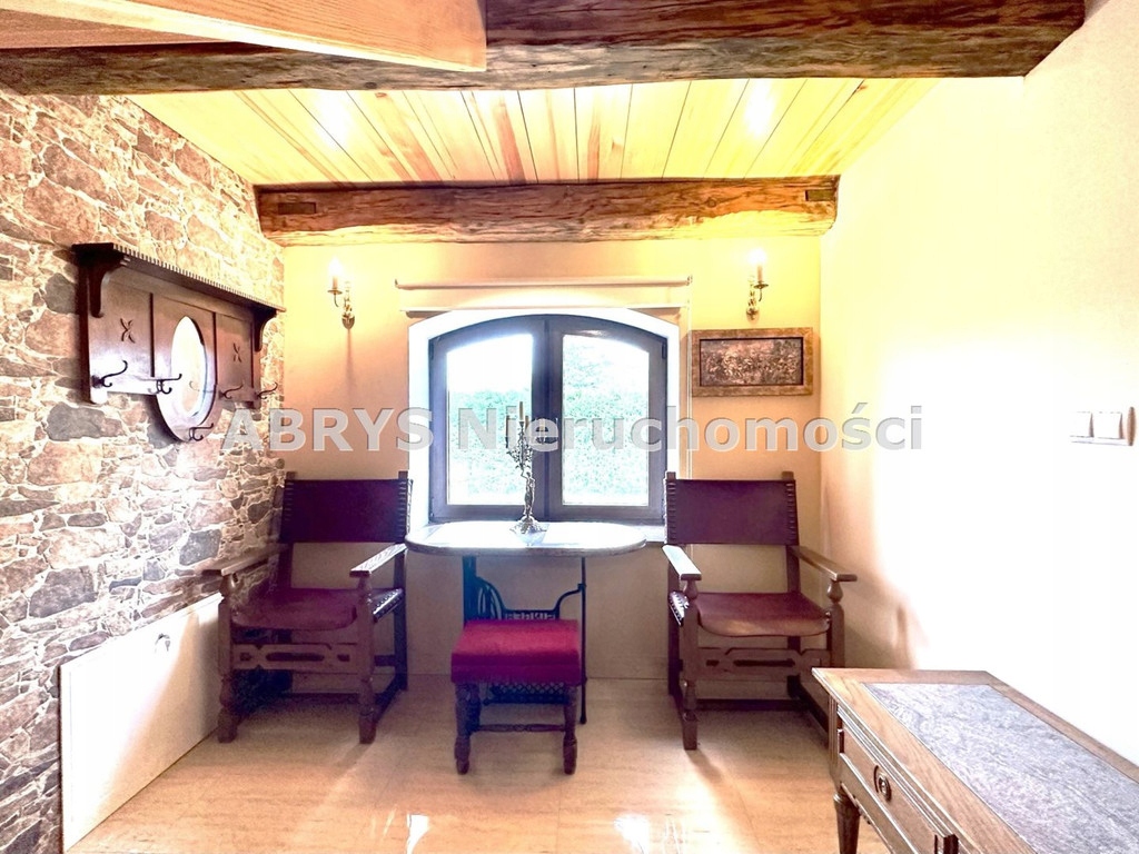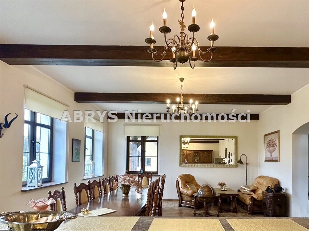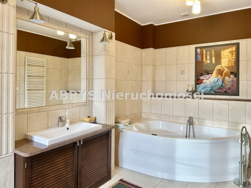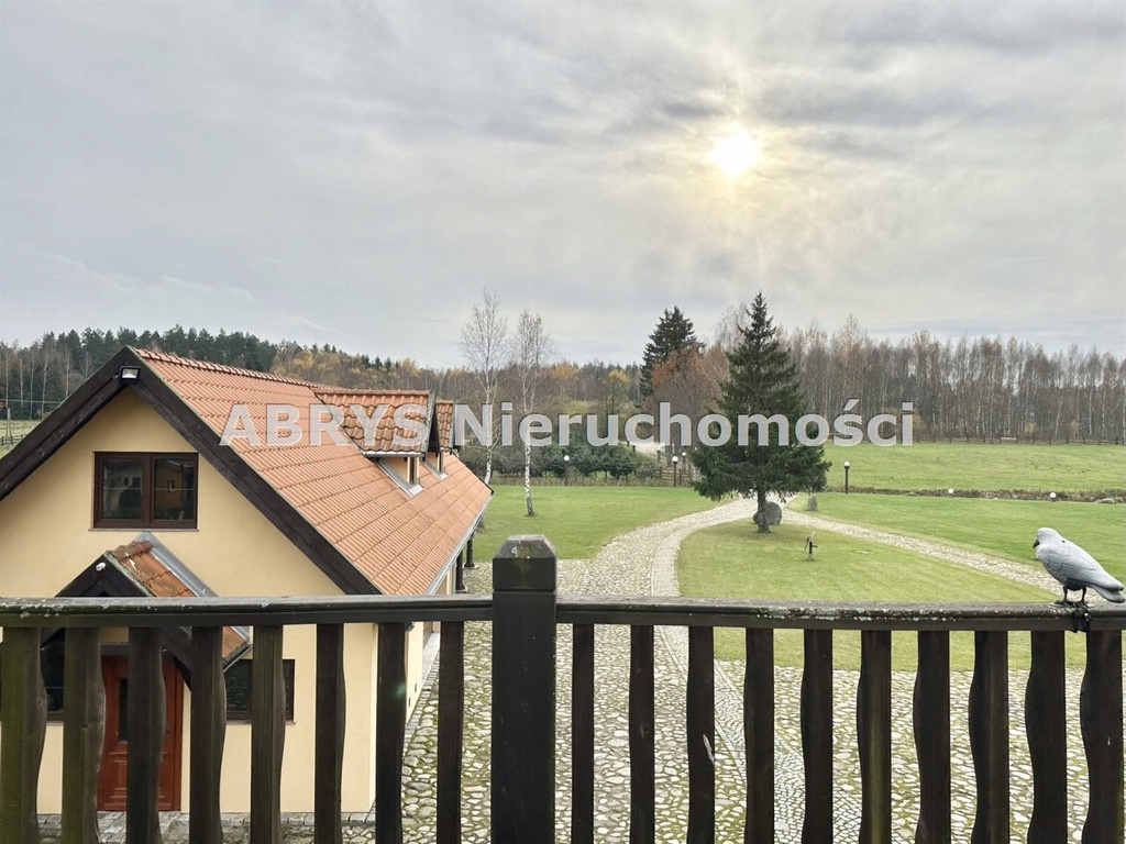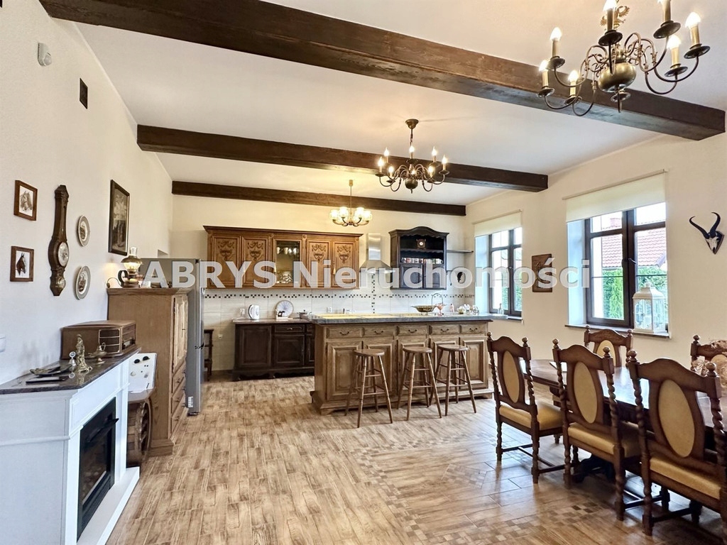 Teren działki ogrodzony w stylu farmerskim z okazałą kamienno- drewnianą bramą wjazdową. Starannie utrzymane trawniki poprzecinane są szerokim podjazdem i krętymi ścieżkami wybrukowanymi kamieniem polnym. Szczególnie malowniczym elementem założenia jest ciąg połączonych ze sobą sadzawek z mostkami i wyspą na której znajduje się pawilon grillowy. Architekturę ogrodową dopełniają kamienne bramki, studnia z kołowrotem oraz kilkadziesiąt punktów świetlnych umieszczonych zarówno przy alei wjazdowej jak i na całym terenie działki. Ponadto przy podjeździe znajduje się budynek garażowy z trzema stanowiskami w części zamkniętej oraz otwartą, zadaszoną wiatą. Na użytkowym poddaszu garażu przestrzeń do dowolnego wykorzystania.