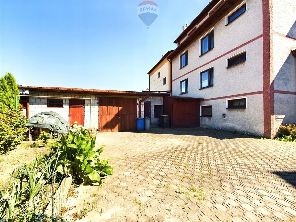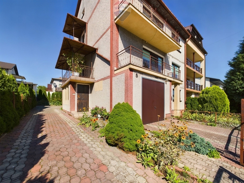 Nieruchomość posiada zadbane podwórko z ogródkiem o wymiarach 13m x 26m, wyłożone kostką brukową, garaż znajdujący się w bryle budynku, wjazd na działkę oraz dodatkowy budynek gospodarczy usytuowany z tyłu domu.