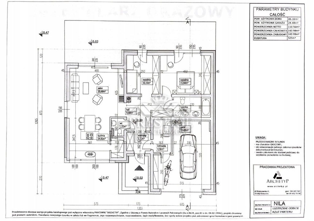 Projekt domu NILA (lustrzane odbicie). Powierzchnia pomieszczeń: