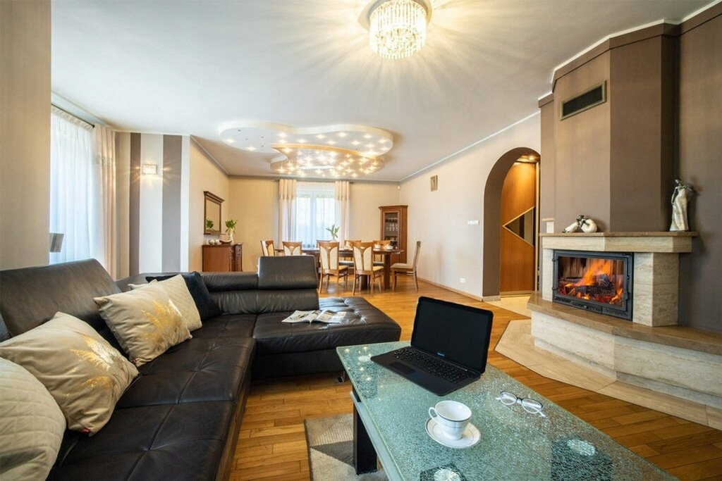 Przekraczając próg domu, wchodzimy do wiatrołapu, a tuż za nim znajduje się przestronny hol. Jego marmurowa podłoga od razu przyciąga wzrok, nadając wnętrzu elegancki i klasyczny charakter już od pierwszych chwil. Hol płynnie przechodzi w imponujący wielkością salon - to bez wątpienia serce tego domu. Pomieszczenie dzieli się na strefę relaksu, której ozdobą jest klimatyczny kominek oraz przestronną strefę jadalnianą, zapewniającą wygodę podczas rodzinnych spotkań przy dużym stole. Z tej części prowadzi wyjście na obszerny taras oraz do ogrodu.
