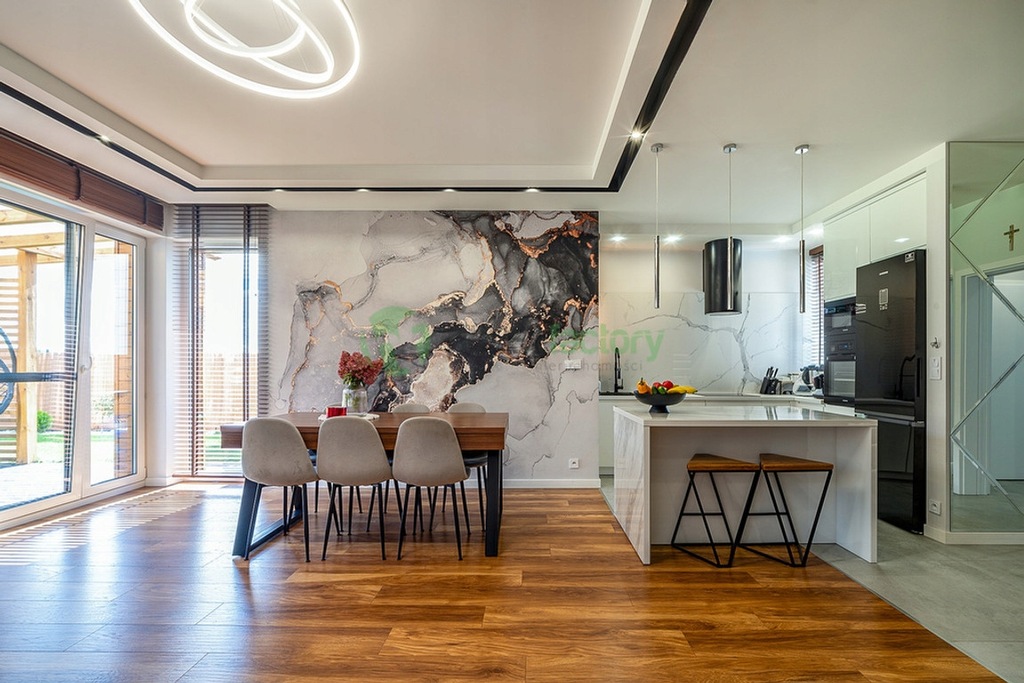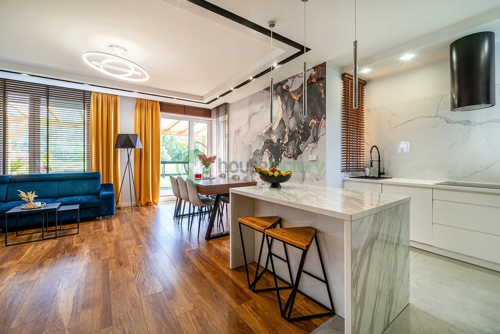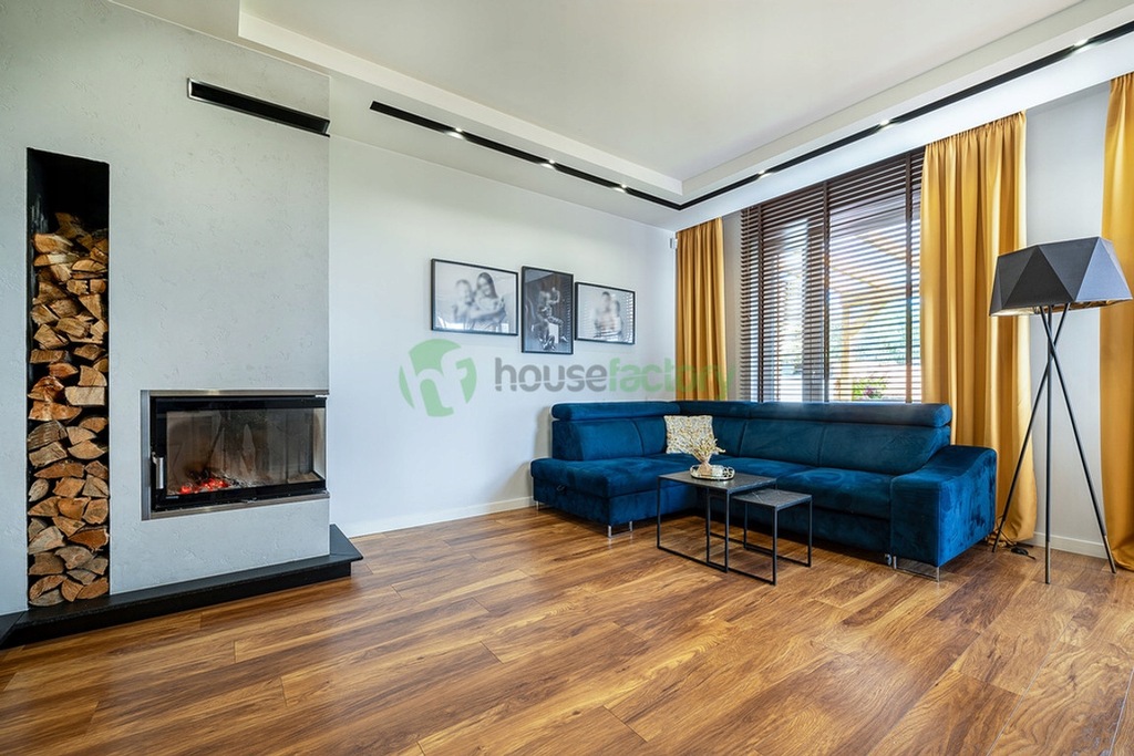 Nieruchomość została wykończona z dbałością o każdy detal, w bardzo dobrym stylu. Wieczorową porą, salon staje się jeszcze bardziej urokliwy, dzięki kominkowi opalanemu drewnem, który wprowadza ciepłą i przytulną atmosferę. Ogrzewanie gazowe z piecem dwufunkcyjnym oraz bojlerem jako alternatywą, to gwar. komfortu cieplnego przez cały rok.