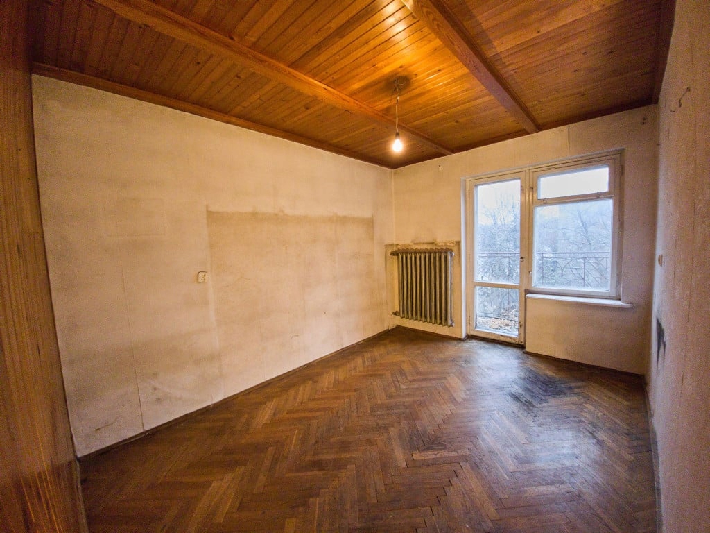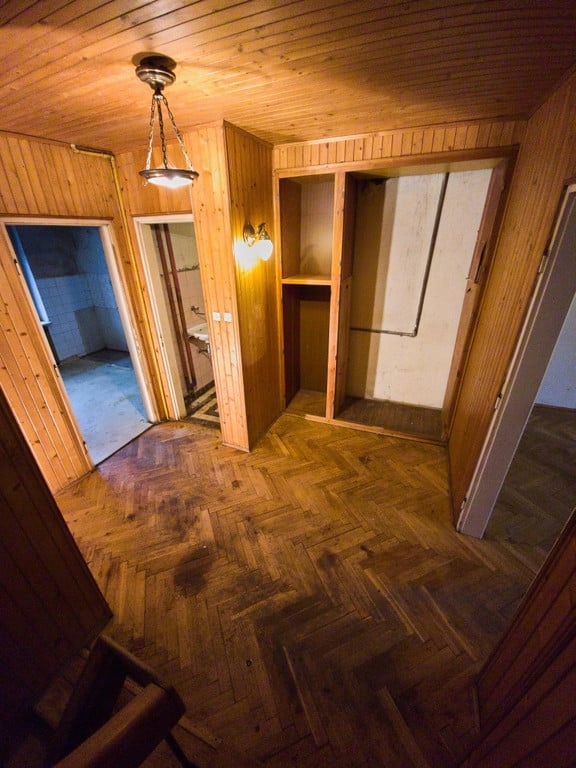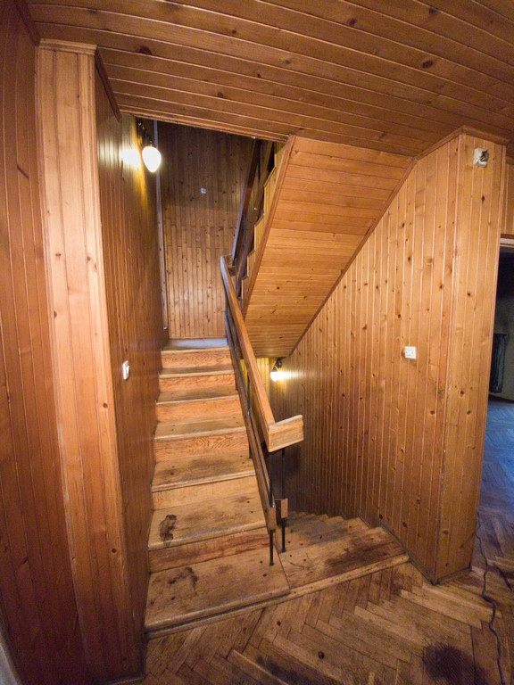 Dom z lat 80 i w takim stylu zastaniemy wykończenie wewnątrz ( boazeria na ścianach i suficie, parkiet na podłodze )