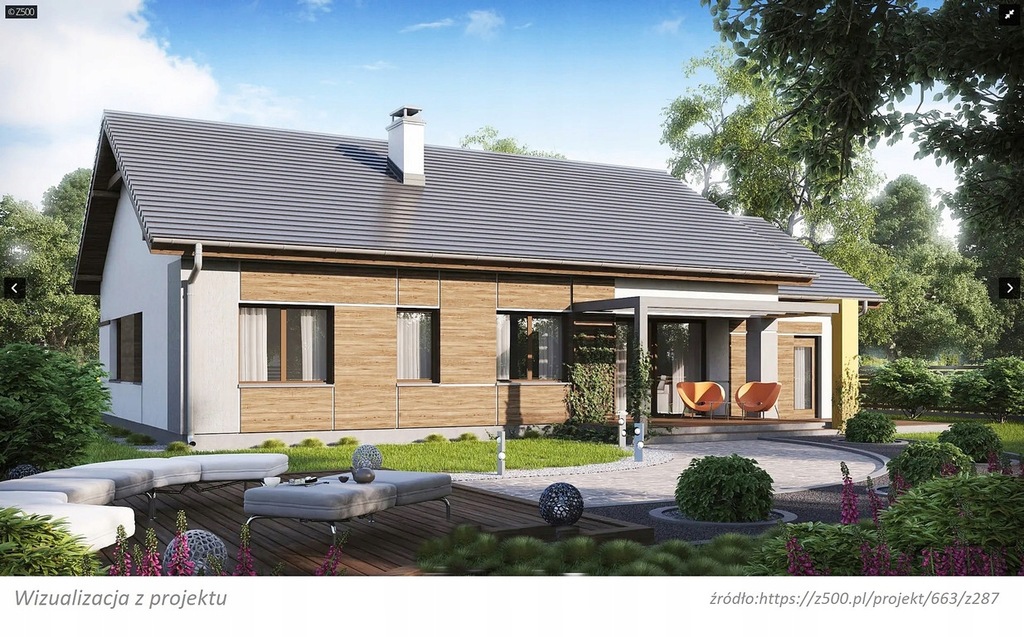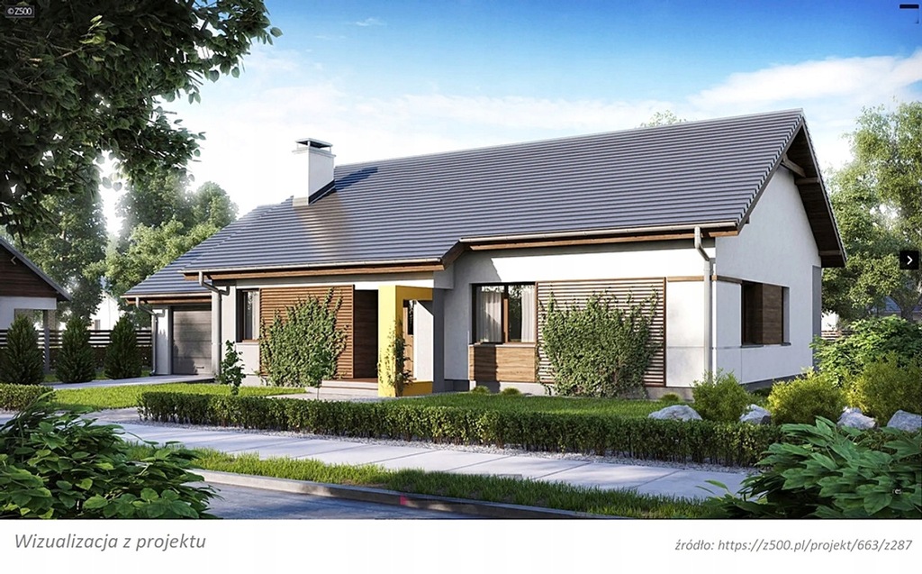 Wolnostojący dom parterowy o pow. 117,80m2 w architekturze z dachem dwuspadowym według projektu „Z287”, położony na osiedlu Radosnym w miejscowości Mnichowo.